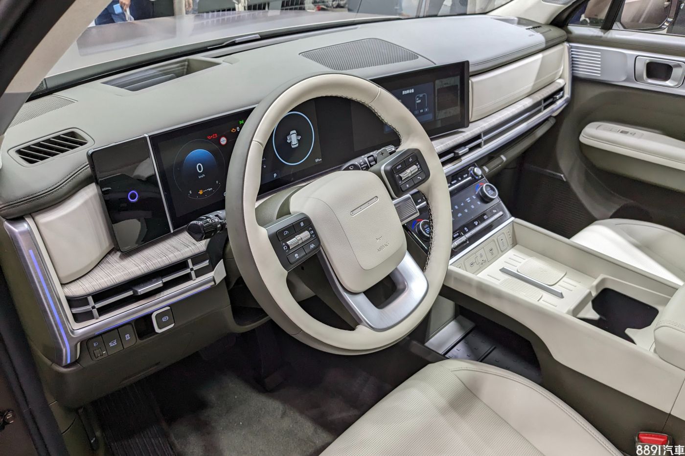 由於在行進間捕獲,無法一睹實車內裝,但參考海外車型,新Santa Fe儀錶台設計以水平線條為主,搭配整合雙12.3吋螢幕的曲面面板,整體風格相當簡潔,若搭配淺色內裝,更能營造開闊的空間感。