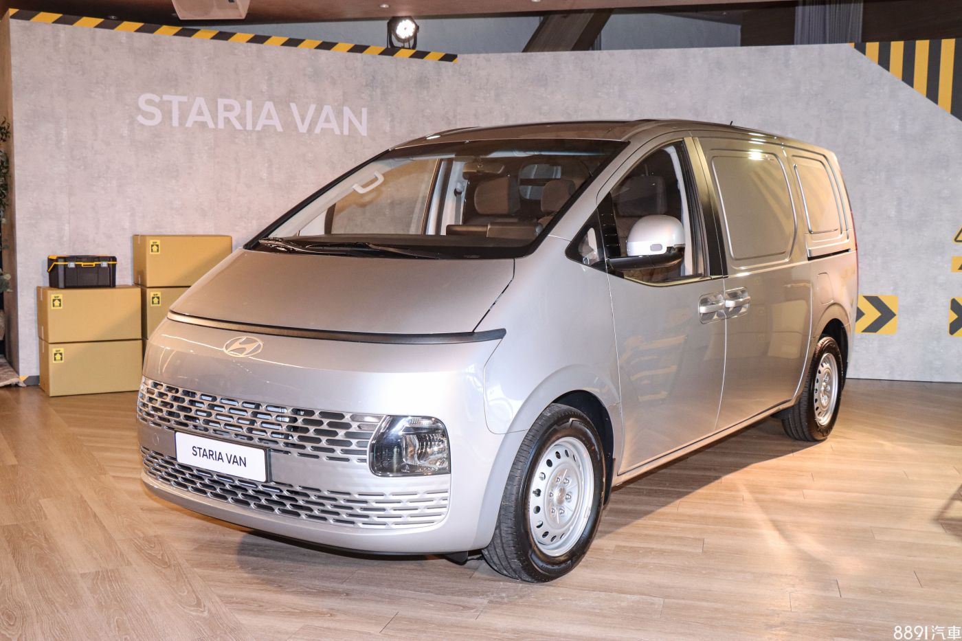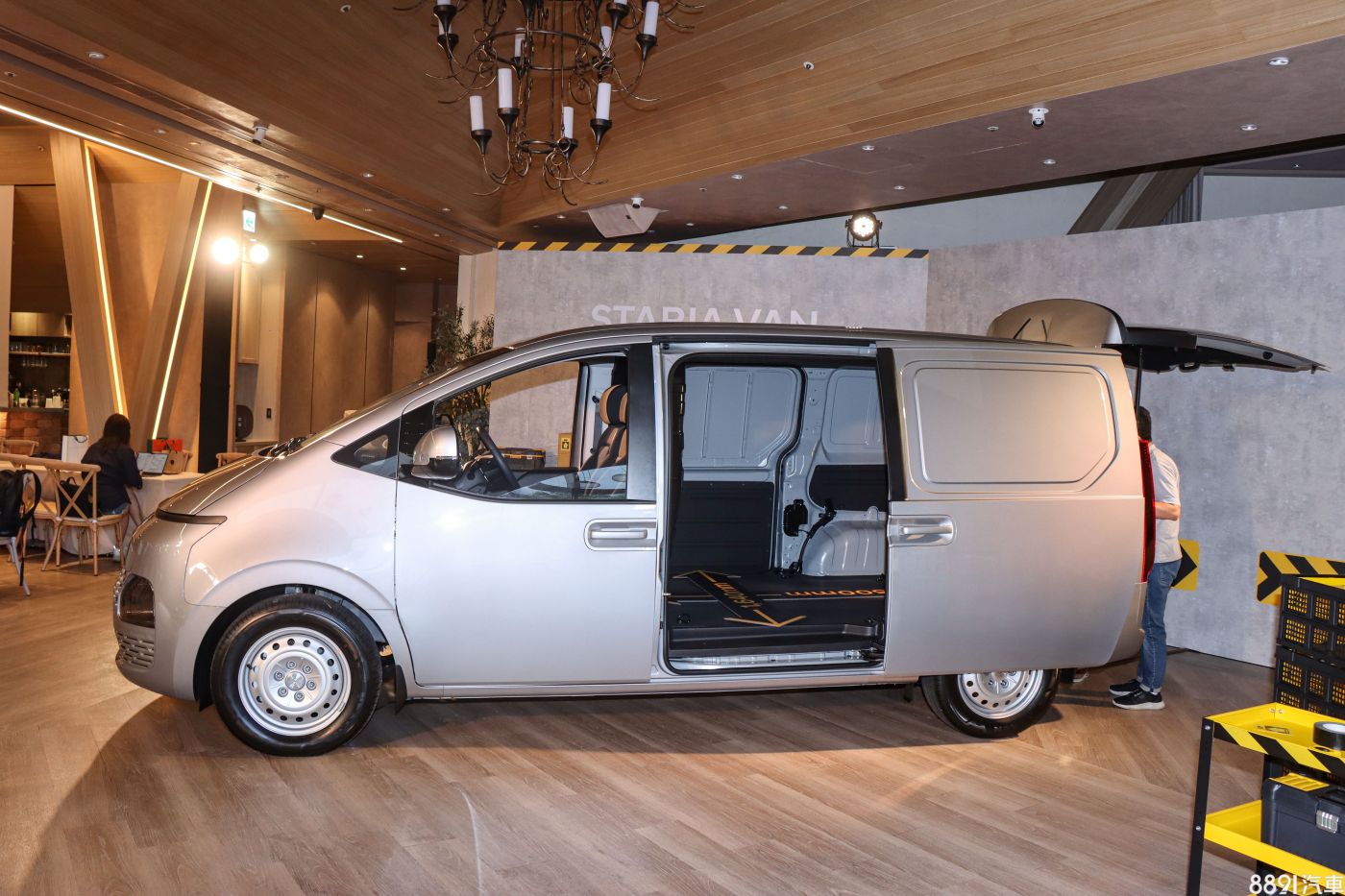 內外配備大致比照標準版Staria GLD-B車型,頭尾燈、日行燈、霧燈等皆為鹵素燈泡,比較明顯的差異是貨車版後座沒有設計車窗,搭配造型簡單的17吋鐵圈,外觀車色有「星際黑」、「星河灰」、「星光白」三種可挑。