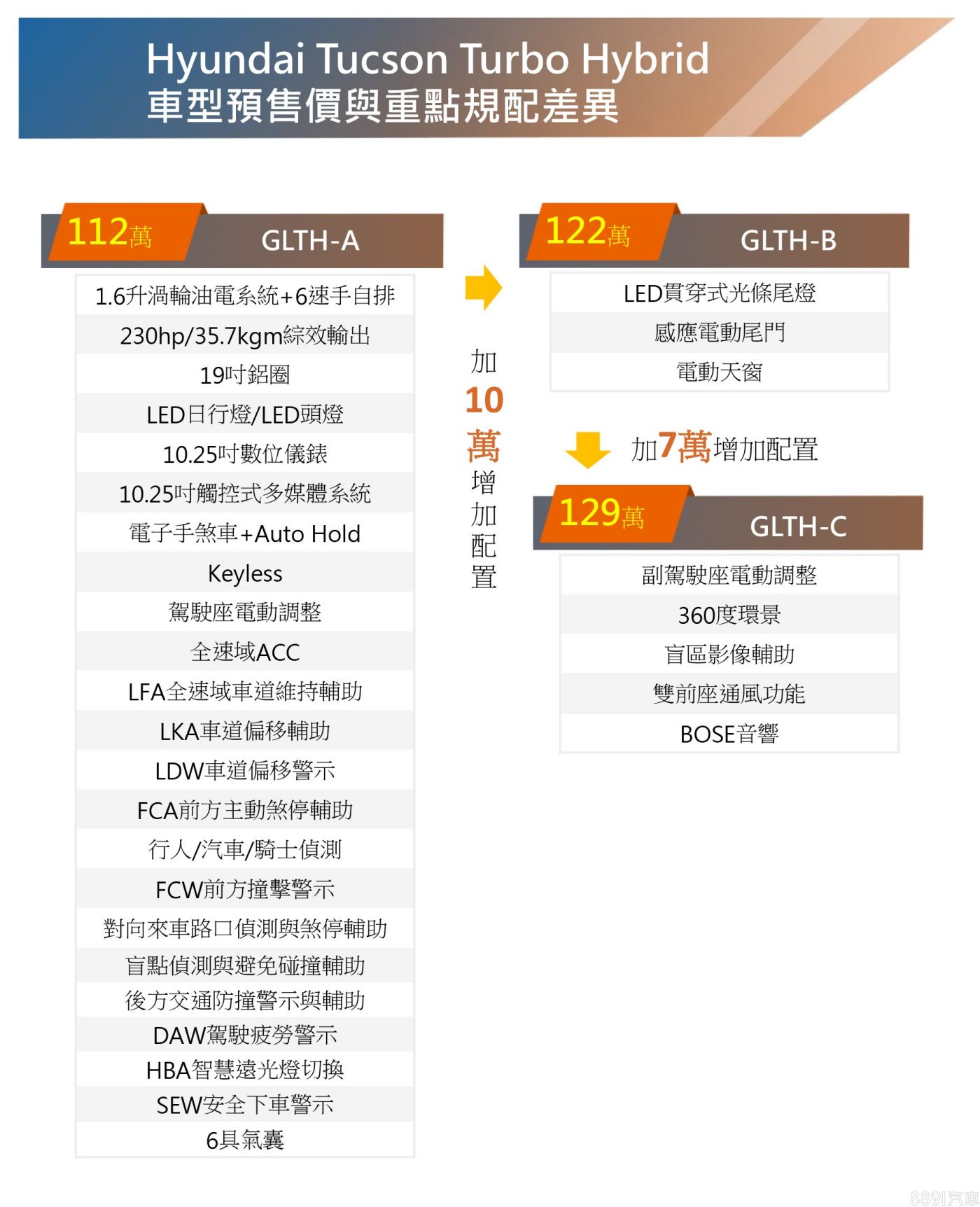 按照官方公布的資訊,Tucson油電全車系均標配19吋鋁圈、雙10.25吋螢幕、駕駛座電調、Keyless以及完整的SmartSense駕駛輔助系統,中階GLTH-B主要多了電動尾門、電動天窗等等,高規的GLTH-C則獨享雙前座通風、副駕駛座電調、BOSE音響等豪華配備,安全部分也增加360度環景、盲區影像輔助。