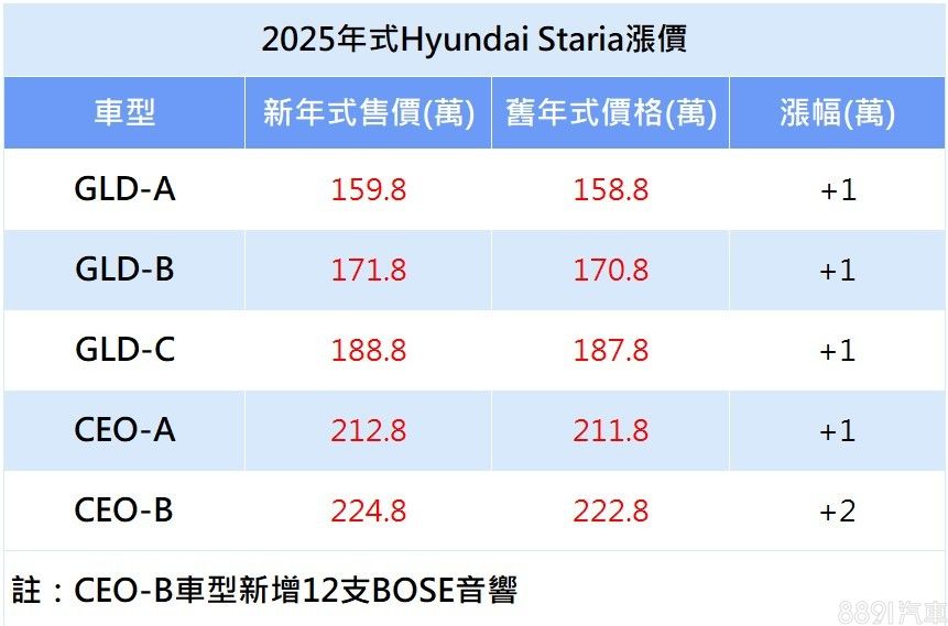 Staria部分也跟進漲價,維持5個車型等級,除最頂規漲2萬元之外,其餘皆漲1萬元。配備部分,差異僅於CEO-B車型加入12支BOSE音響系統,其他車型配備皆無變動。