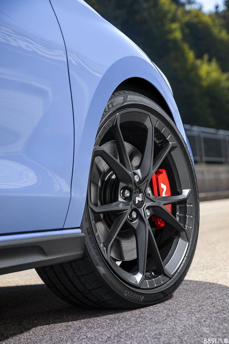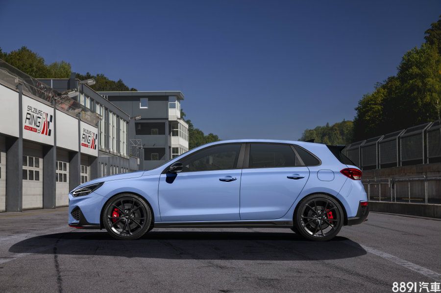車側方面最顯而易見的是換裝新款18吋鋁圈,標配米其林Pilot Super Sport,若選用性能套件,將升級成19吋輕量化鍛造鋁圈,比現款同尺寸鑄造鋁圈減重14.4kg,五輻V型式樣搭配深灰色消光烤漆相當耐看,與N Car專屬的紅色卡鉗形成鮮明對比,同時導入eLSD電子限滑差速器,前碟盤也從345mm加大至360mm,並配備倍耐力專為i30 N開發的P Zero高性能胎。