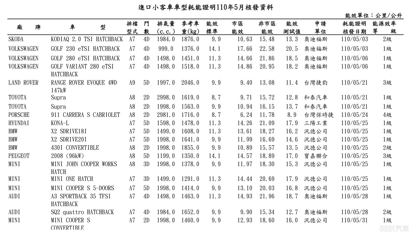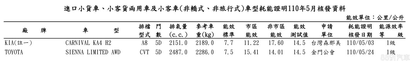 而4月已上市的Kia Carnival,能源局油耗數據也出爐,在2.2升四缸柴油引擎搭8速手自排助推下,繳出平均油耗14.5km/L、能源效率一級的表現。