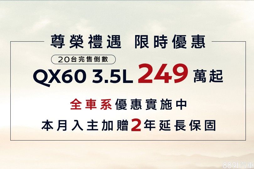 根據國內官網所述,3.5升的QX60目前僅餘20輛庫存,這也是我國最後一批裝載V6引擎的Infiniti,一旦全數完售後,也代表QX60 3.5L正式告別台灣市場。