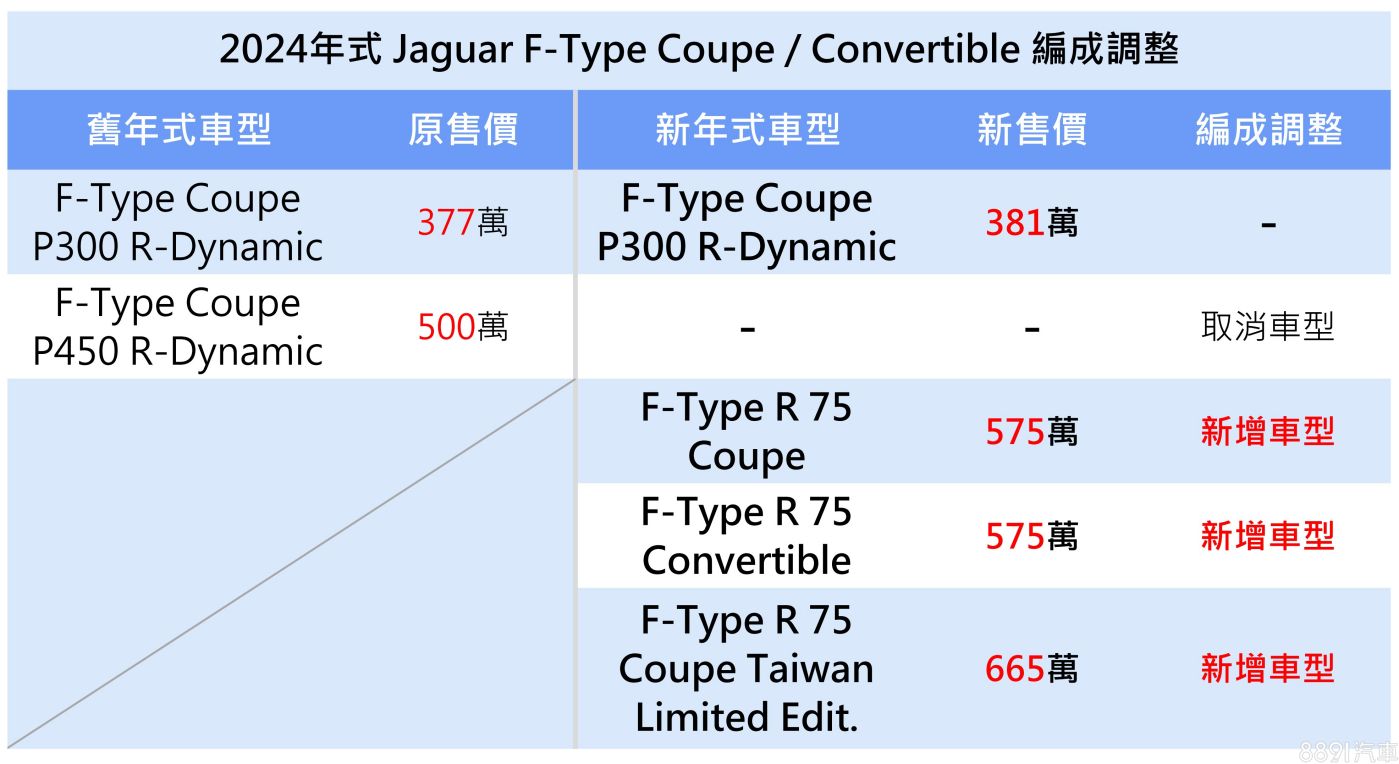 Jaguar當家跑車F-Type,在台灣推出2024年式車型,陣容仍以四缸的P300作為入門款,但新增「F-Type R 75」紀念版本,後者提供Coupe和Convertible敞篷車型可選,還特別針對台灣市場打造「F-Type R 75 Taiwan Limited Edition」限量車型。