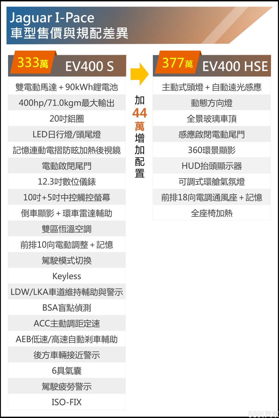 在車型編成上,首波導入EV400 S與EV400 HSE兩款車型,建議售價分別為333萬元起及377萬元起(已含電動車貨物稅減免21萬元),且第一波車主更加贈7kW家用壁掛式充電器,鋰電池也同樣跟上主流,擁有8 年或16萬公里原廠保固,同時享有Jaguar全車系一致之5年原廠保養專案。