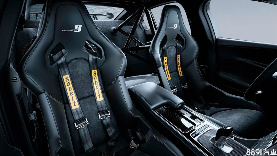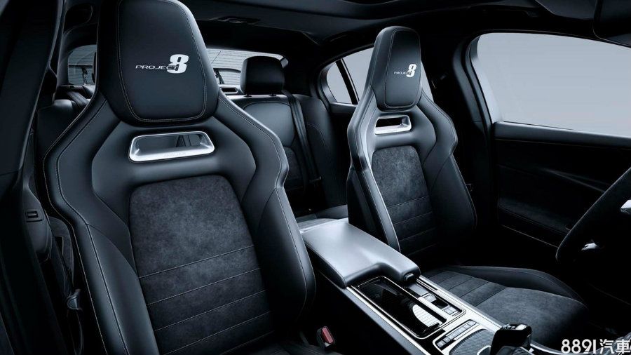 XE SV Project 8擁有雙座與一般四座兩種設定,四座版配備專屬運動座椅,頭枕並有Project 8字樣,車內採大量碳纖維材質飾板。雙座版則搭配專屬不可調賽車座椅、4點式安全帶與防滾籠。