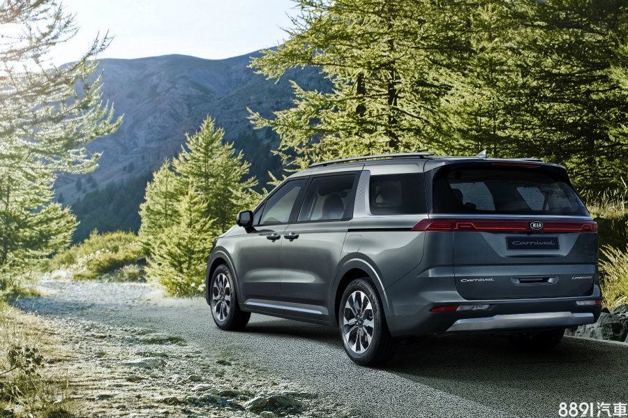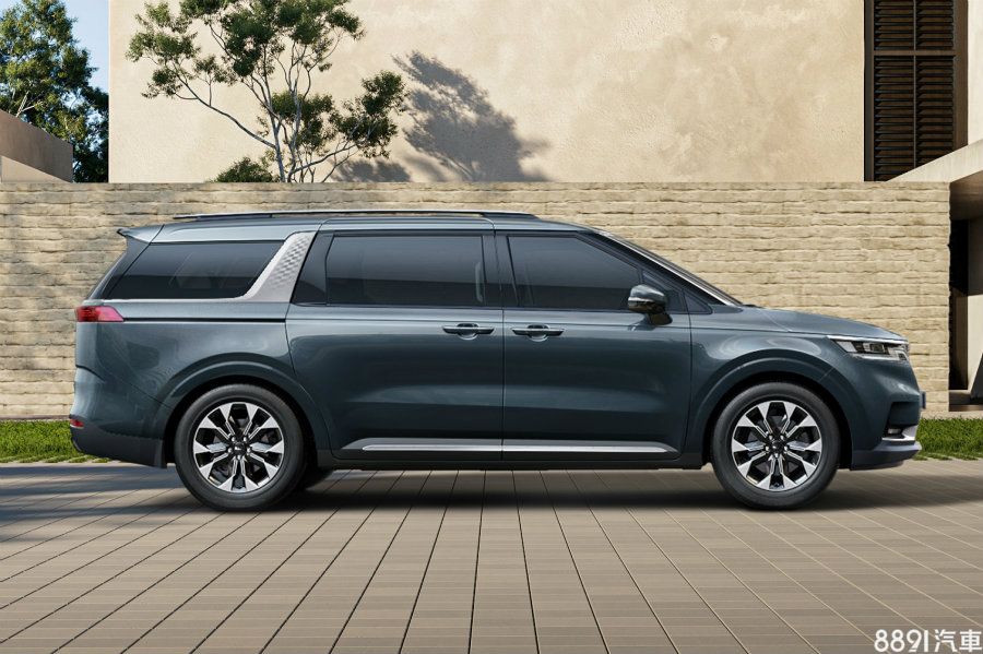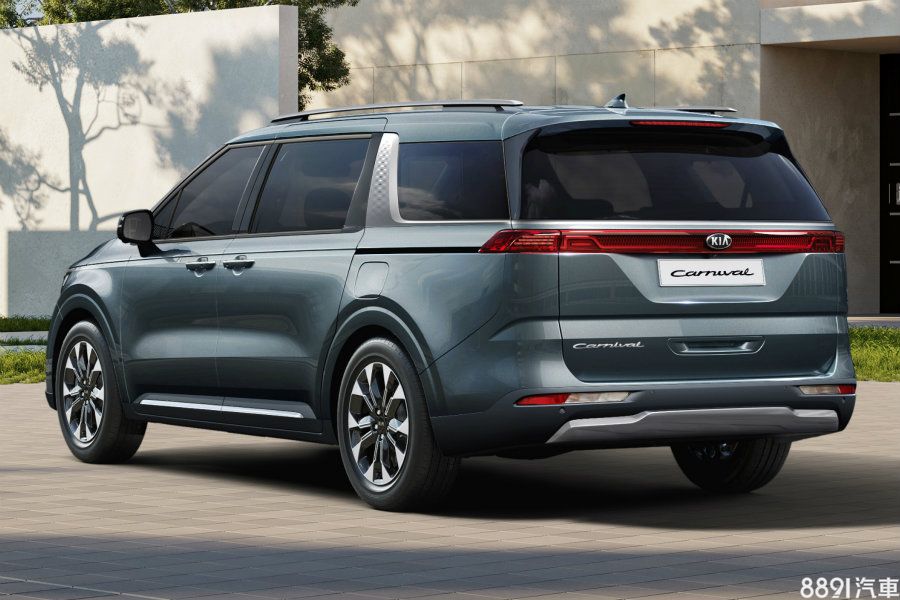藉由C柱金屬飾板的勾勒,新Carnival略帶點雙廂皮卡的輪廓。原廠並宣稱,藉由縮短前懸及加長軸距,新Carnival具備更充裕的車室縱向空間。輪圈則依車型等級提供17~19吋做搭配,圖中之雙色五幅款即為19吋之造型。