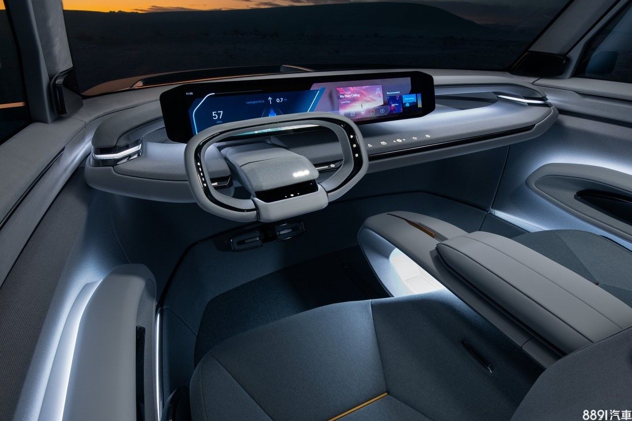 EV9概念車室內採用橫向線條向外延伸,前方視野上相當寬闊,內裝鋪陳十分簡約,幾乎找不到實體按鍵,並以一具27吋大型螢幕涵蓋儀錶與多媒體系統。
