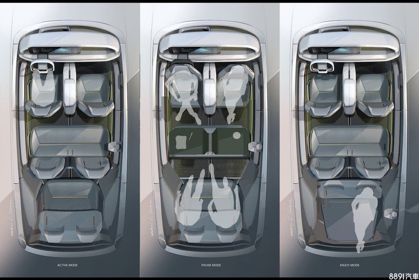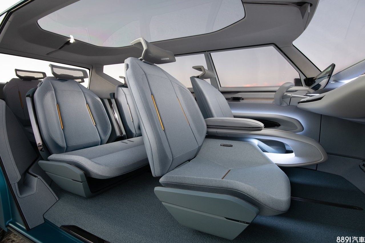 座艙提供Active、Pause、Enjoy三種模式可調,三排座椅都設計有滑軌可以移動,舉例而言,在Pause模式下,第一排座椅轉向,搭配二排座椅向下收折,就可以與對三排乘客面對面,創造出會議交談的空間。