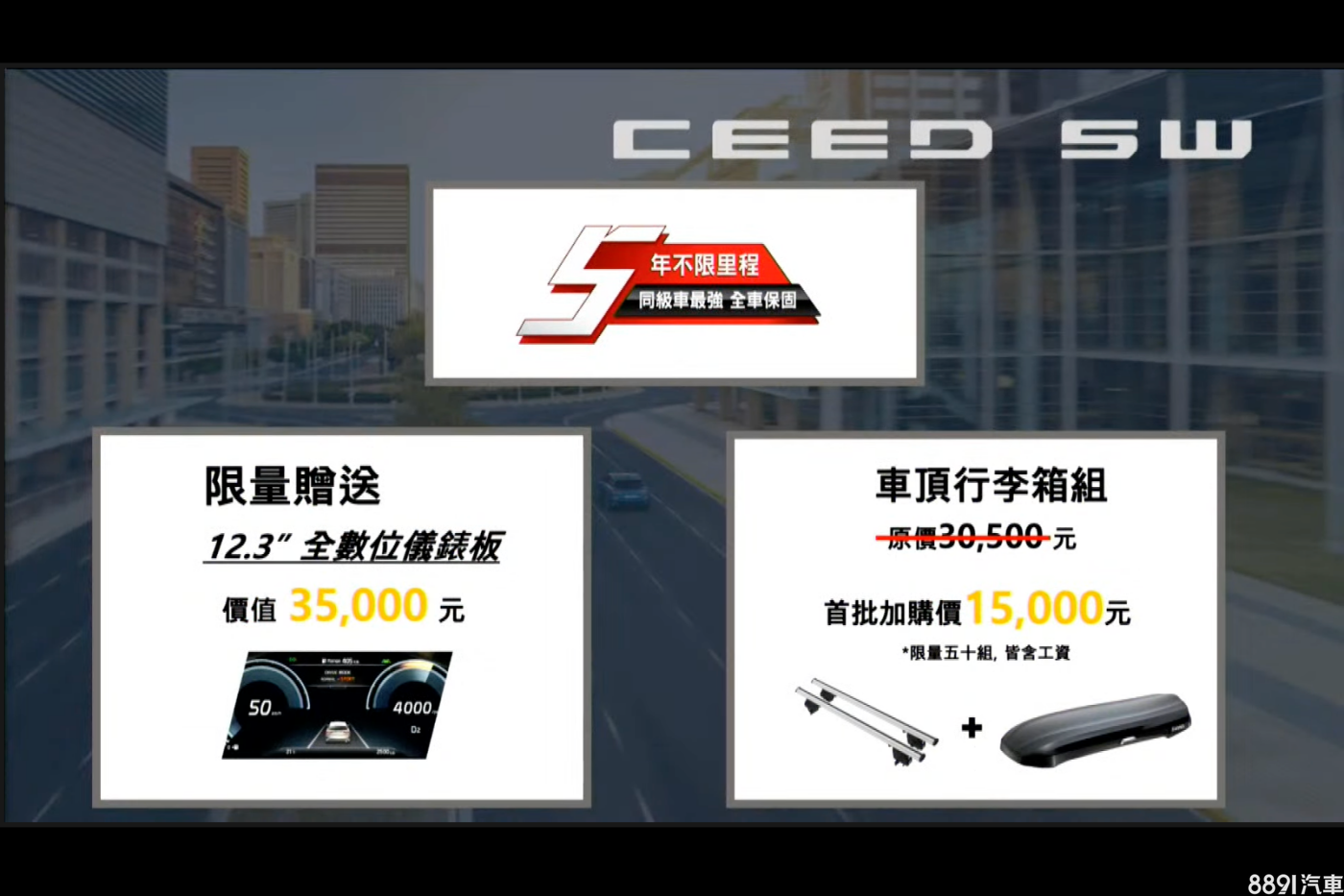 而除了數位儀錶的免費升級,原廠亦推出車頂行李箱組的加購優惠,15000元即可享有原價30500的車頂行李廂組,限量50組要買要快,同時也提供5年不限里程原廠保固服務。