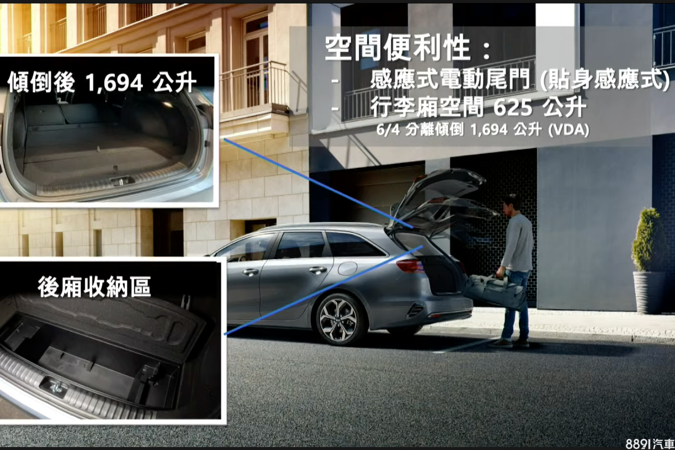 受惠於旅行車修長身段的優勢,在標準狀態下提供625L行李廂容積,並具備4/2/4椅背分離傾倒功能,最大可擴充至1694L,並標配感應式啓閉電動尾門。