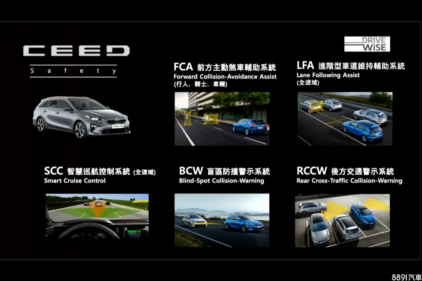 安全輔助配備相當完善,標配Drive WiSE智慧安全輔助系統,包含FCA前方主動煞車輔助、全速域LFA進階型車道維持輔助、全速域SCC智慧巡航控制、BCW盲區防撞警示、RCCW後方交通警示等,達到符合Level 2自動駕駛分級之標準。