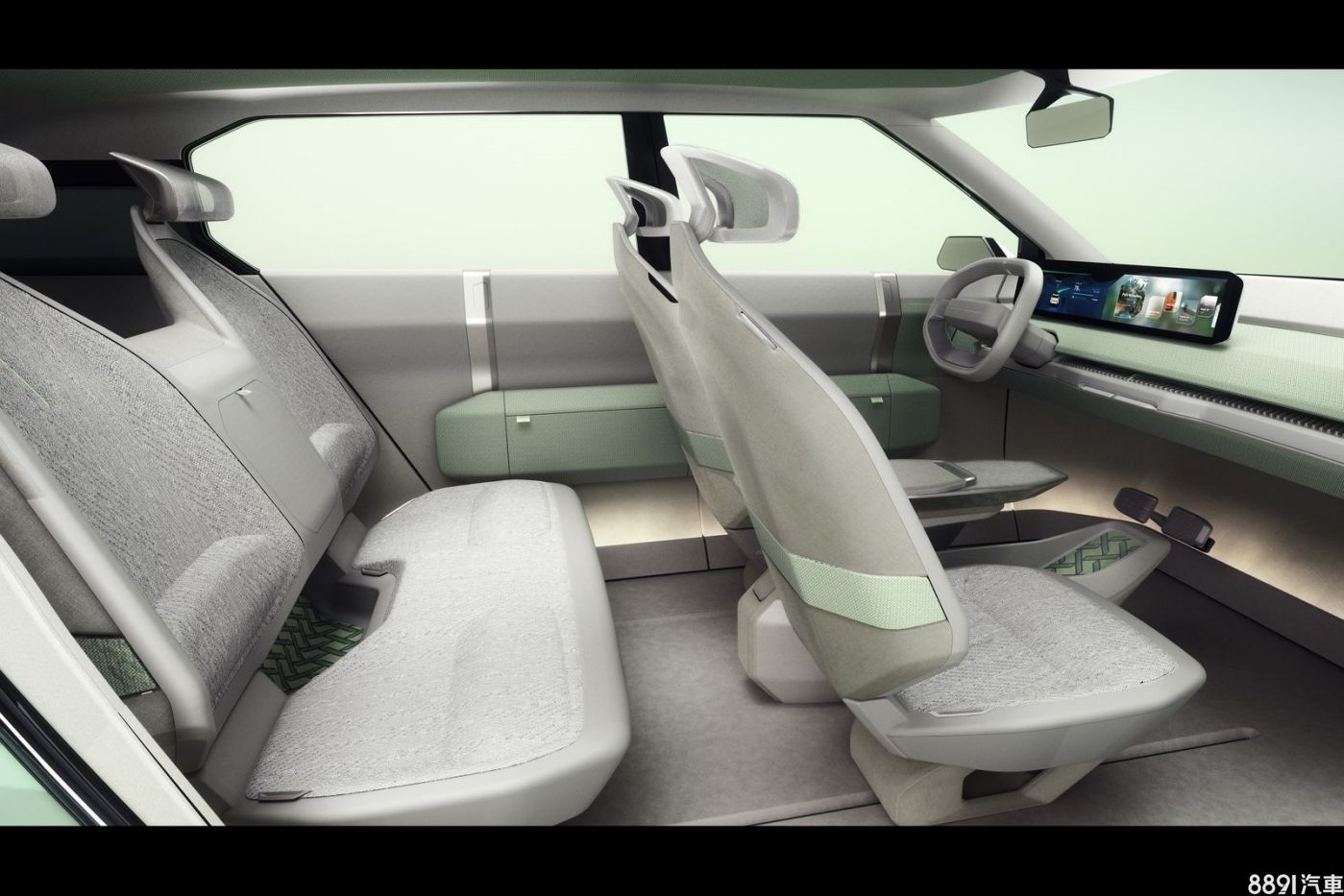 內裝設計理念以開闊簡潔為主,並以天然染料、可回收再生棉料、編織麻來妝點內裝,提倡永續環保,儀錶、中控螢幕則有多種主題,除了燈光、顏色變化,UI介面造型也會改變,此外設計師強調依舊會獨立設置空調區域,不會因過度簡化元素,影響實際操作性。