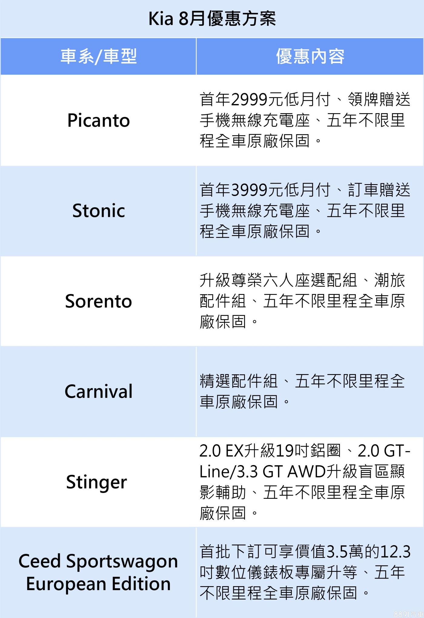 為了讓社會新鮮人、小資族也能輕鬆入主,Kia為Picanto推出「新鮮人想購就GO」專案,首年低月付僅需2999元,並享無線充電座免費升級;品牌其他車款也享有專屬優惠方案,詳情可見附表。