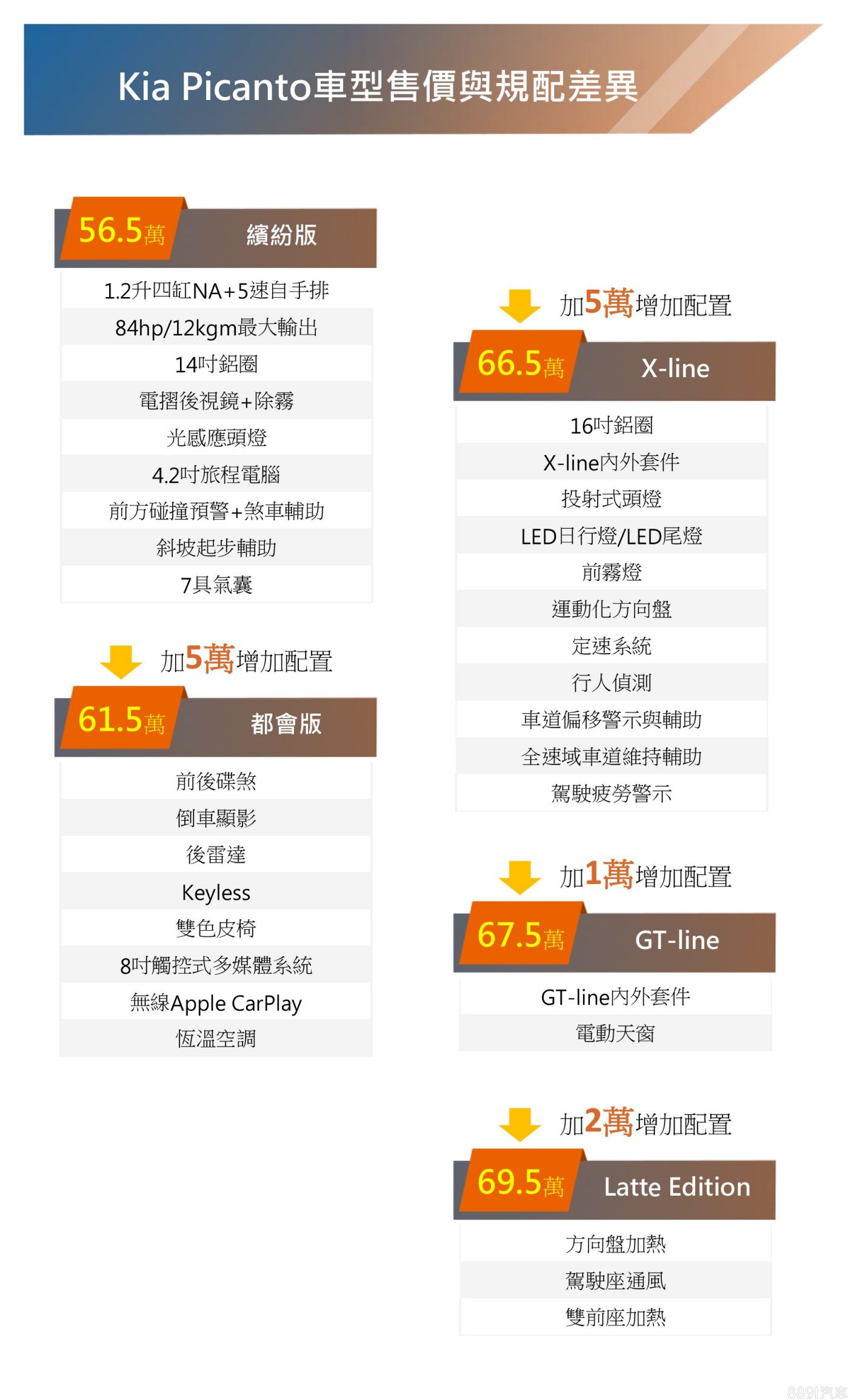 Picanto Latte Edition是以GT-line車型為基礎,可選專屬塗裝,並追加配備,原先既有的四種版本也持續販售,全車系提供繽紛版、都會版、X-line、GT-line、Latte Edition五種選項,售價分別為56.5、61.5、66.5、67.5及69.5萬元,重點規配如附表。