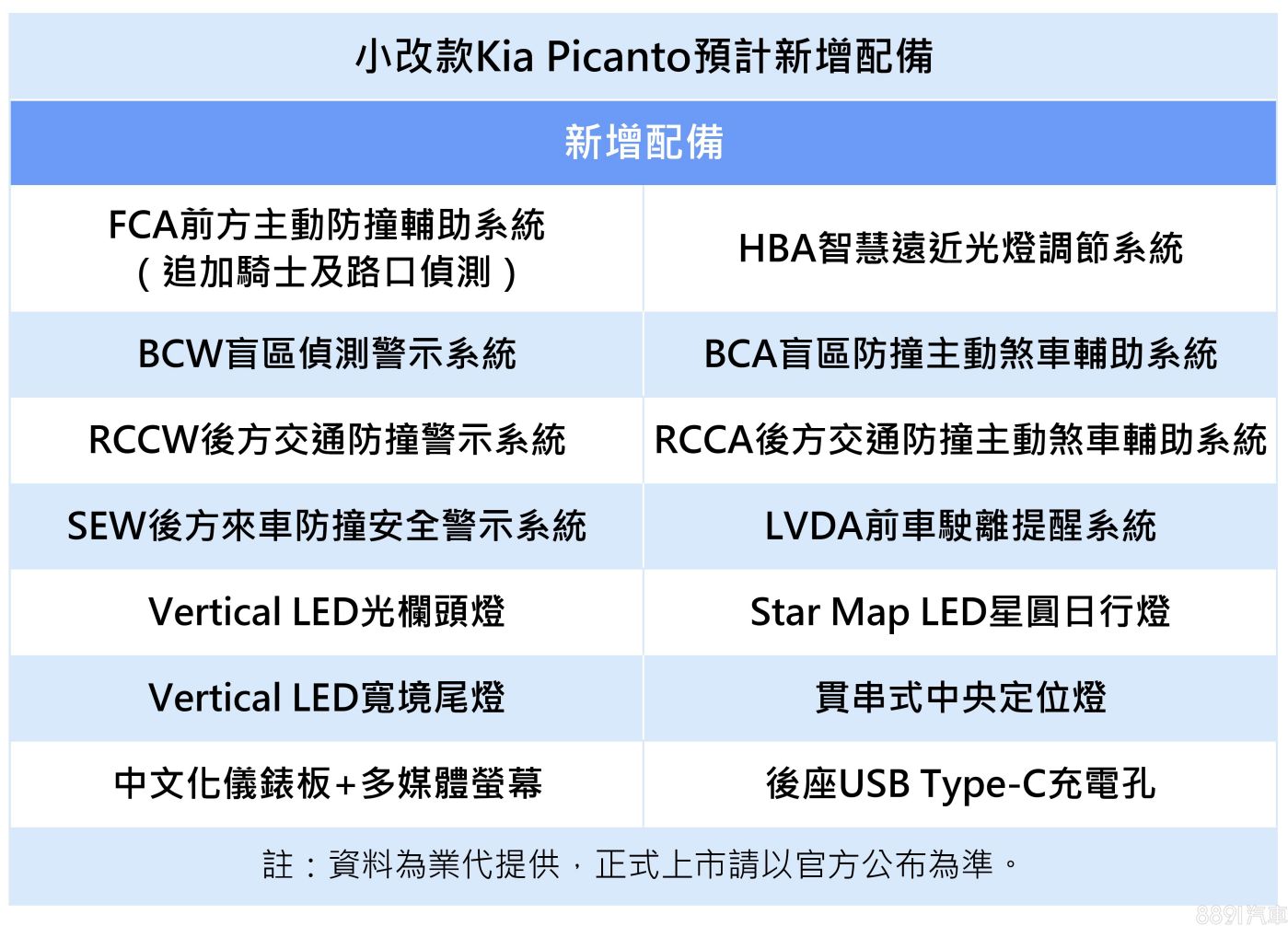 據掌握到的情報,小改款Picanto新增配備重點主要在駕駛輔助,包含前方主動防撞輔助系統,除了原有偵測行人、車輛外,也追加騎士及路口偵測,並且導入盲區偵測警示、盲區防撞主動煞車輔助、後方交通防撞警示、後方交通防撞主動煞車輔助、前車駛離提醒、遠近光燈主動調節等等,依舊主打「最安全小車」的產品賣點!
