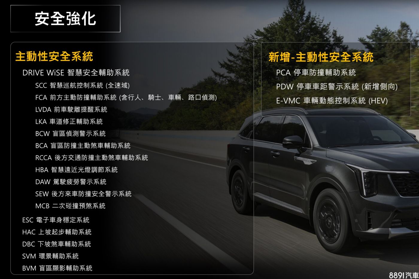 安全輔助方面,符合Level 2等級的Drive Wise駕駛輔助系統預期仍作為全車系標準配備。另外,Sorento亦隨小改款新增PCA停車防撞輔助、側向PDW停車車距警示,並針對油電款新增E-VMC車輛動態控制系統。