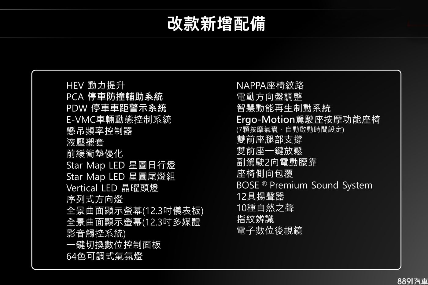 國內依然導入「2.2升柴油」和「1.6升油電」兩種動力,但輸出略有調整,柴油款194hp/45.0kgm的最大出力,比起原款略降8hp;油電款最大綜效輸出則從230hp/35.7kgm稍稍提升至235hp/37.4kgm。兩種動力均有前驅或四驅車型可選。