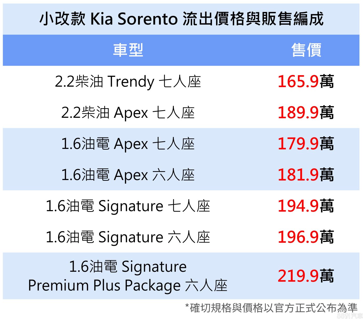 由於網路資訊真實性可議,8891汽車也透過原廠經銷端做側面瞭解,大致確認流出資訊與品牌內部資料相符。然而,由於目前曝光資訊仍未盡完整,小改款Sorento的國內確切售價與配備規格,仍應以未來官方公布為準。