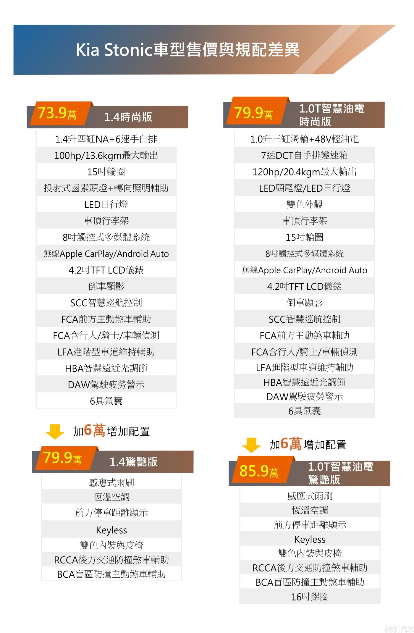 小改款Stonic國內規劃雙動力、4車型編成,分別為1.4時尚版、1.4驚艷版、1.0T智慧油電時尚版、1.0T智慧油電驚艷版,正式售價維持接單價,依序為73.9、79.9、79.9和85.9萬元,動力方面導入48V輕油電,主動安全也補齊ACC主動巡航控制系統與LFA全速域車道維持。