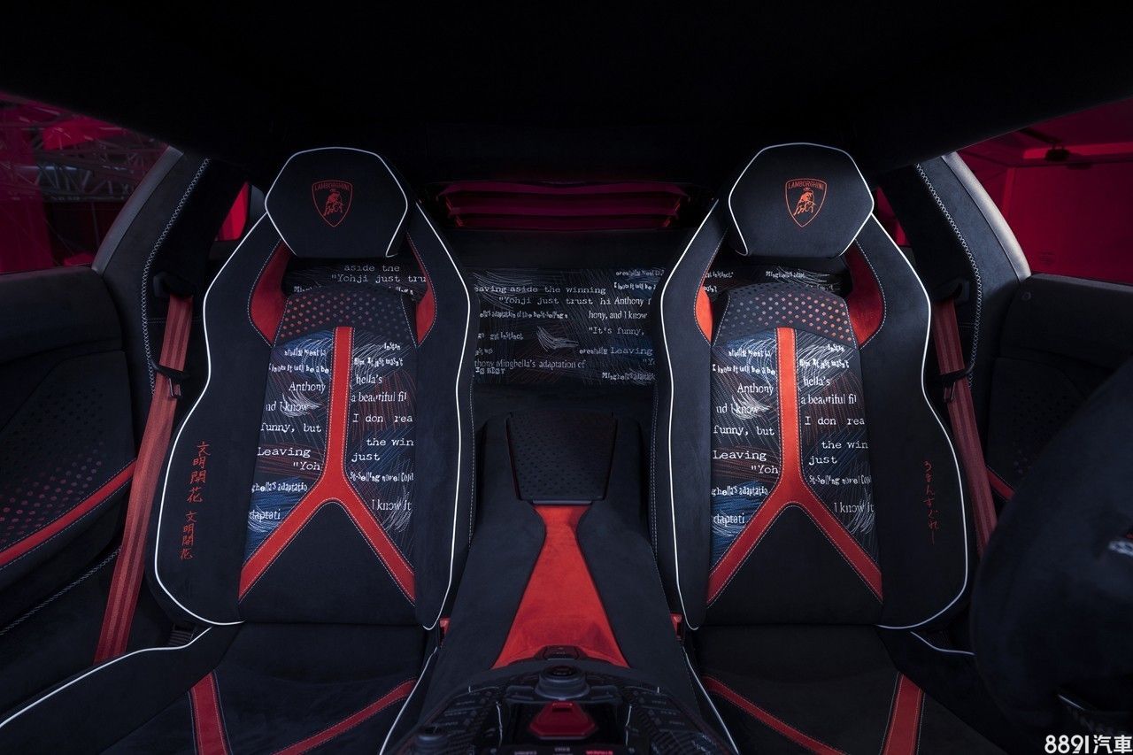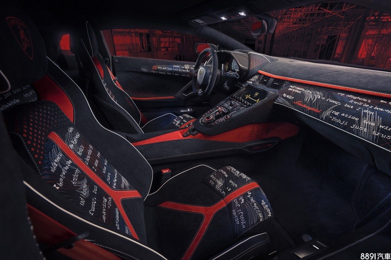 車內同樣有大量的文字彩繪,並且用縫線製造隨興塗鴉感,基底則是大面積麂皮材質。山本耀司表示:「通過這次合作,讓Lamborghini品牌識別度更高,也突顯兩品牌對於年輕族群、流行文化的獨特性與激情!」