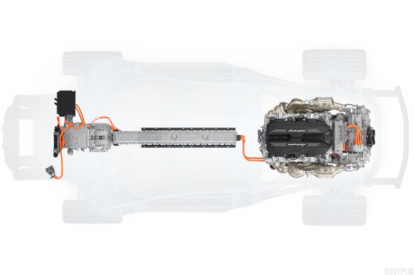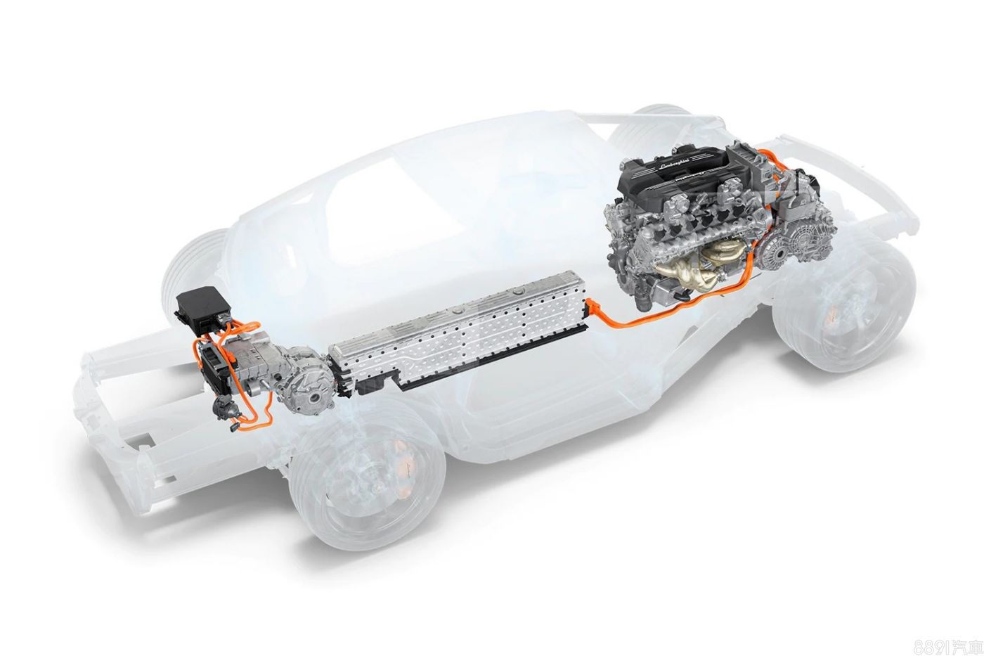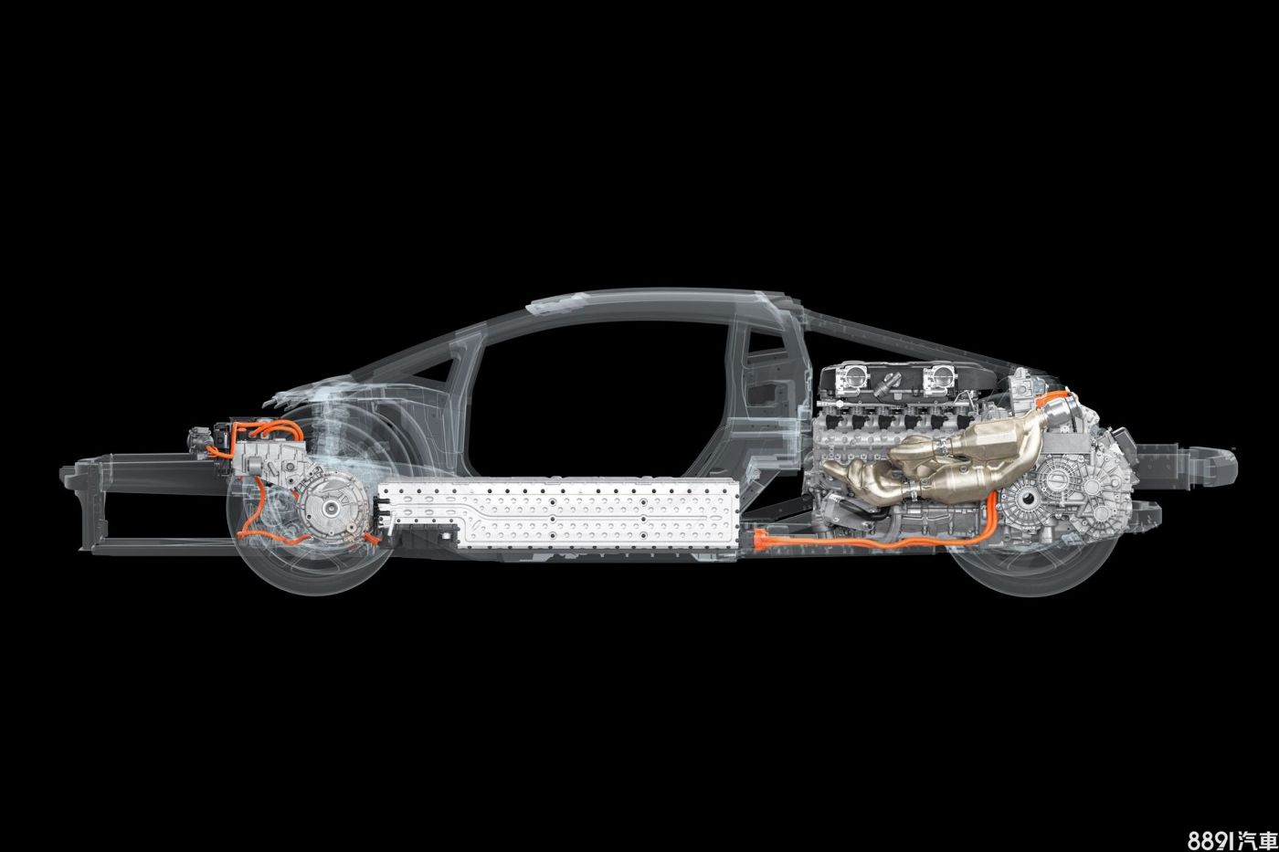 油電搭配換來1015hp的最大綜效馬力,0~100km/h加速只要2.5秒,極速則達350km/h。少了傳動軸,中船下方空間就留給鋰離子電池組,不過規格僅有3.8kWh,沒電時透過引擎可於6分鐘內充滿,或花個半小時用7kW的AC交流慢充充飽電,至於純電行駛里程則未獲公布。