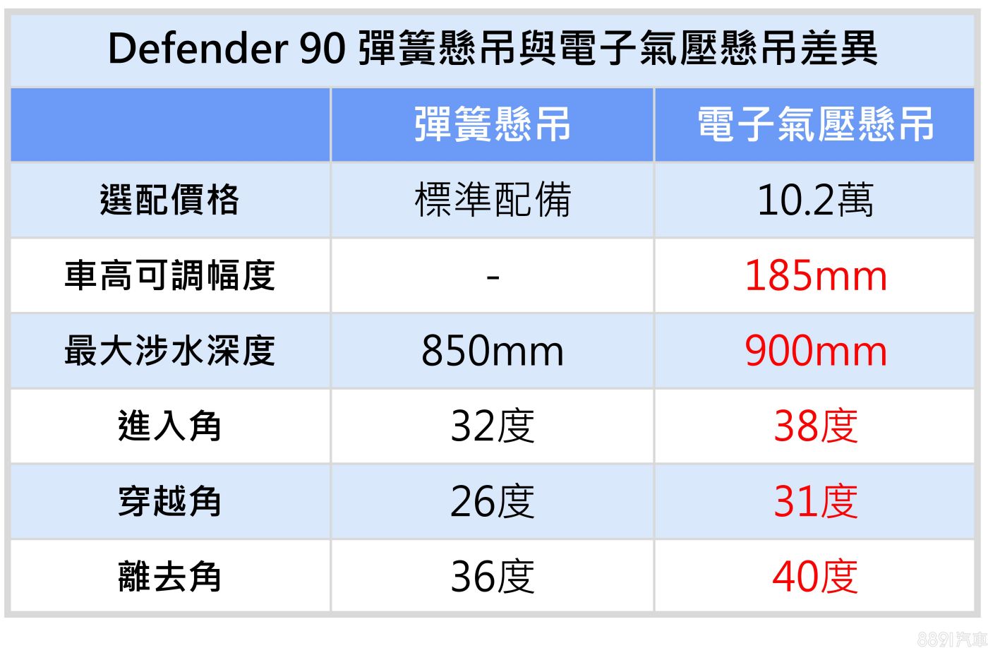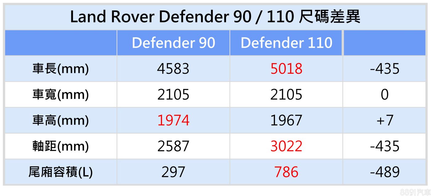 而數據上可見,Defender 90車長及軸距皆較長軸版短了435mm,其餘尺碼則無明顯差異。