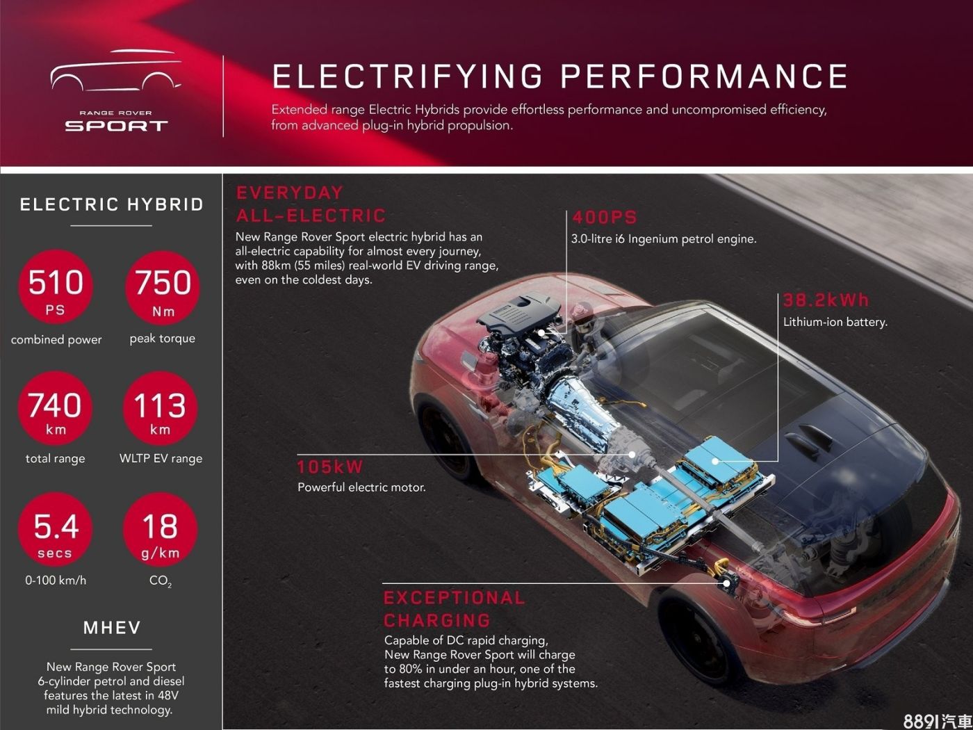 同時新一代Range Rover Sport也提供PHEV插電式油電混合動力,預計擁有P440e、P510e兩種車型,由3.0升直列6缸渦輪引擎,搭配功率105kW的電動馬達、38.2kWh鋰電池組,兩款車型純電最高可達時速100km/h,純電續航里程則上看113km,原廠另預告將於2024年首度推出純電版本。