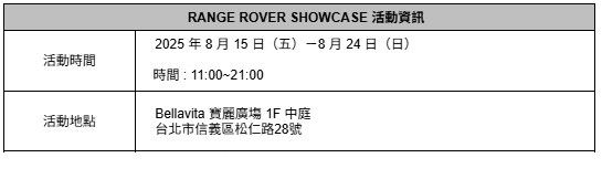 為慶祝這歷史性的一刻,Range Rover將於2025年8月15日(五),至8月24日(日),在台北信義區Bellavita寶麗廣場1F中庭,打造現代奢華主體空間,呈現「Range Rover Showcase」專屬展演。