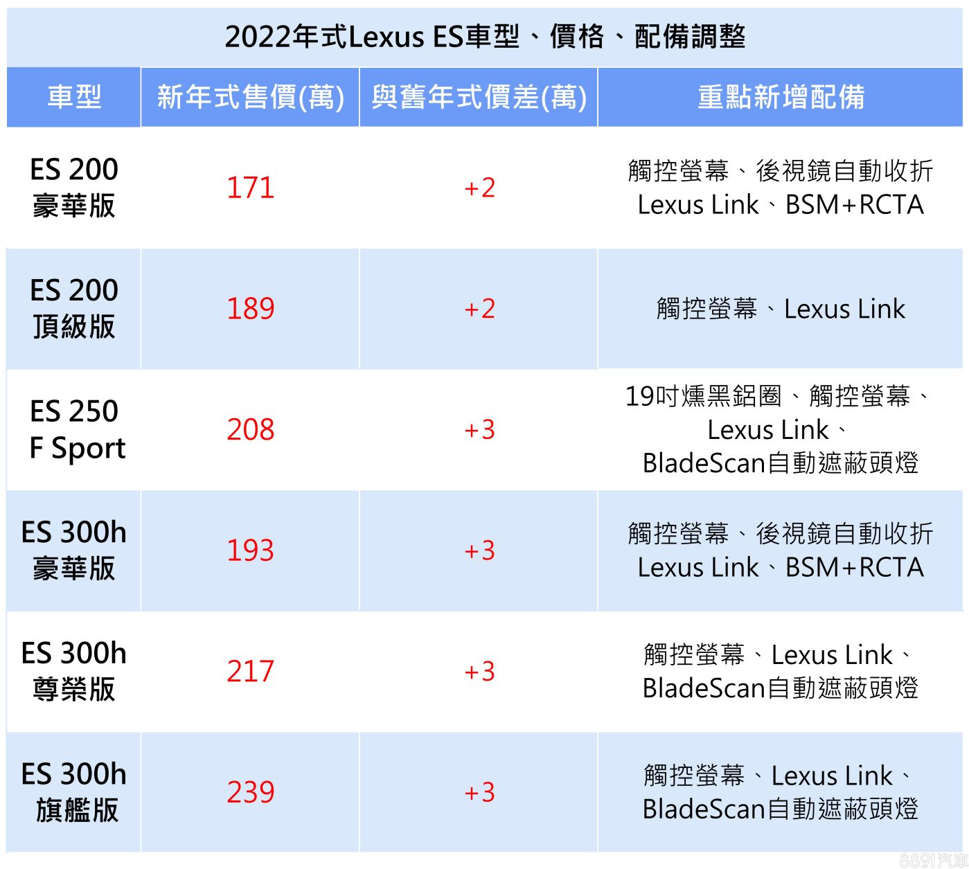 小改款ES正式在國內上市,維持過去分搭3種動力的6車型編成,價格帶則落在171~239萬,除了ES 200小漲2萬元,其餘車型皆較原款漲價3萬,主要更新重點落在車載系統介面及部分駕駛輔助系統的升級,並訂下年銷4500的販售目標。