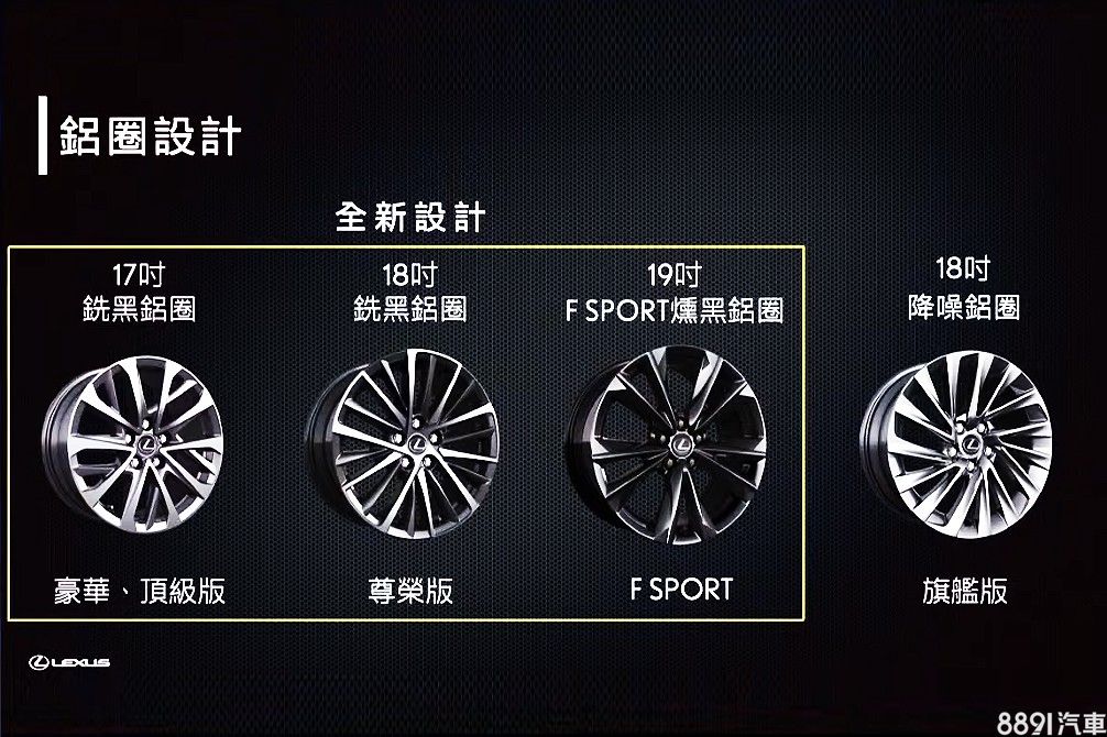 6款車型中,僅F Sport車型自18吋鋁圈升級為19吋新款,其餘車型雖維持既有規格,但除了頂規款外,皆隨本次更新換上新鋁圈造型。