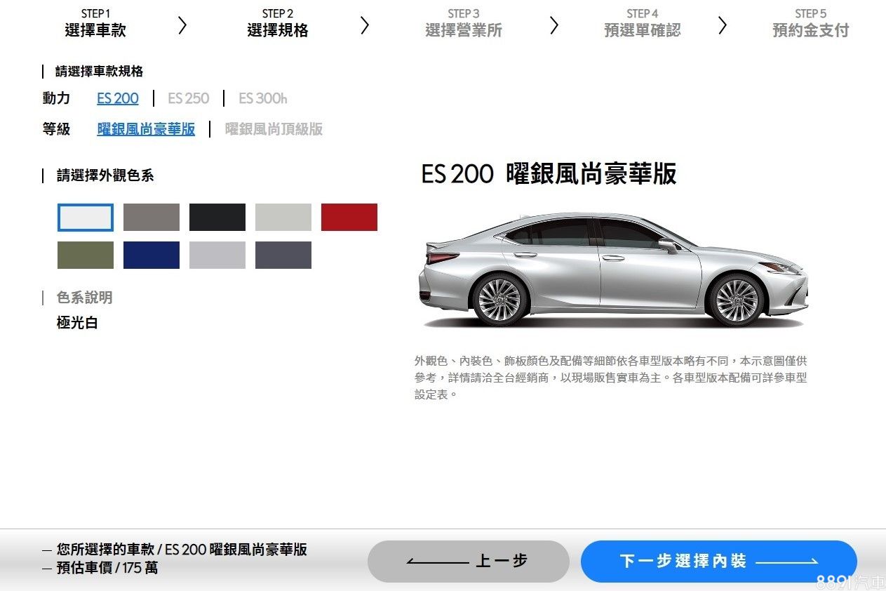 ES 200以原豪華版、頂級版為基礎,推出「曜銀風尚豪華版」與「曜銀風尚頂級版」,建議售價同為175萬、193萬,其餘250及300h編成維持不變。