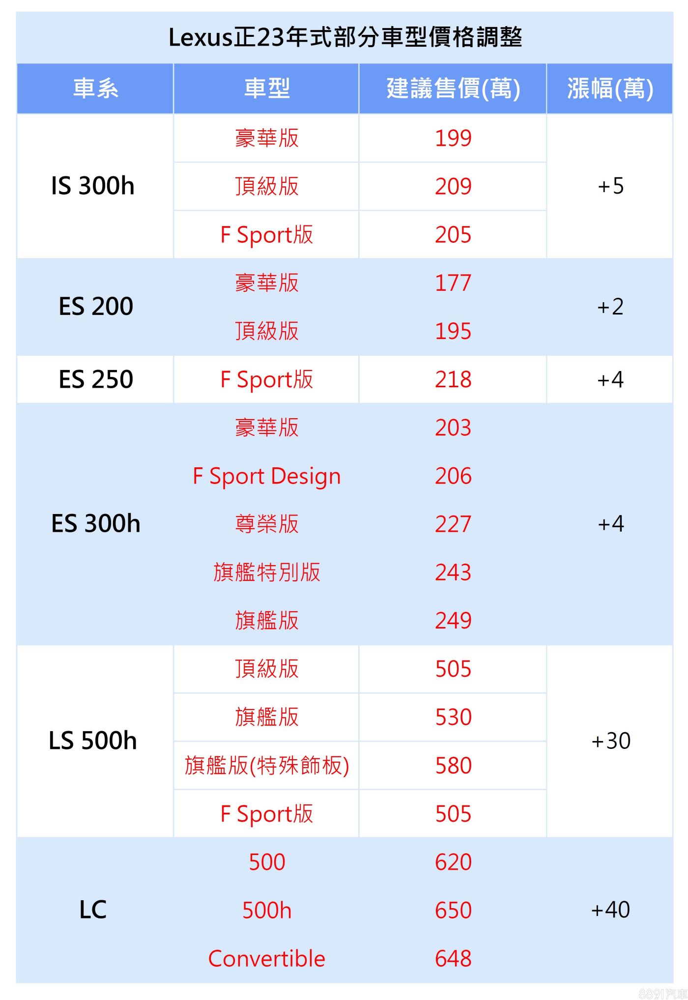 Lexus這次調漲的車型主要以轎車為主,其中IS全車系均漲5萬,ES依動力有著不同漲幅,入門的200漲2萬,250及300h則漲4萬,漲幅最高的為LC車系,大漲40萬之多,還在觀望、想搶便宜的消費者,有「現車」的話真的要快。