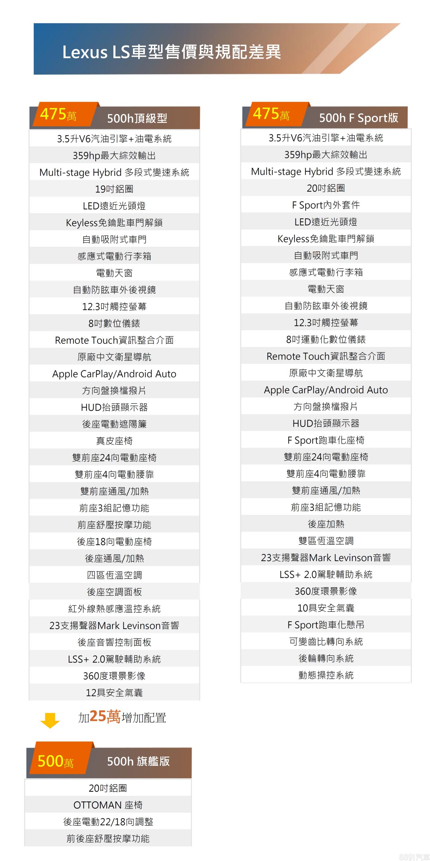 做為入手門檻的頂級版及F Sport版,皆將定價設於475萬,較以往338萬起的售價提高不少。另有旗艦版以500萬上市,雖說較原款小降一萬,但不再標配後座影音系統。不過針對旗艦版買家,原廠以50萬選配價推出「Kiriko切子飾板」和「西陣織飾板」可選,為車室增添日本匠藝風雅。