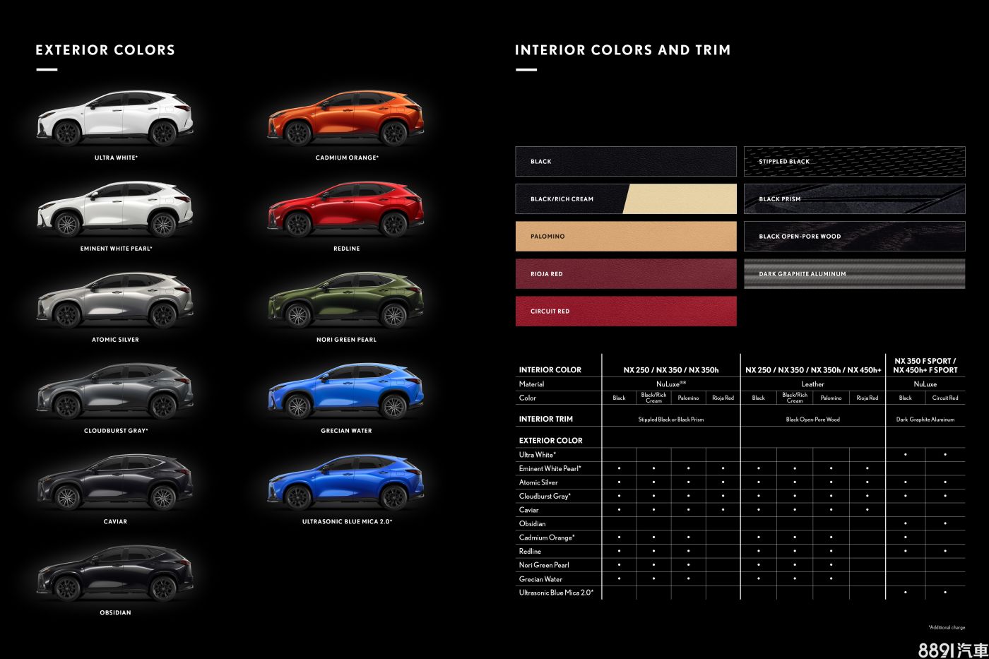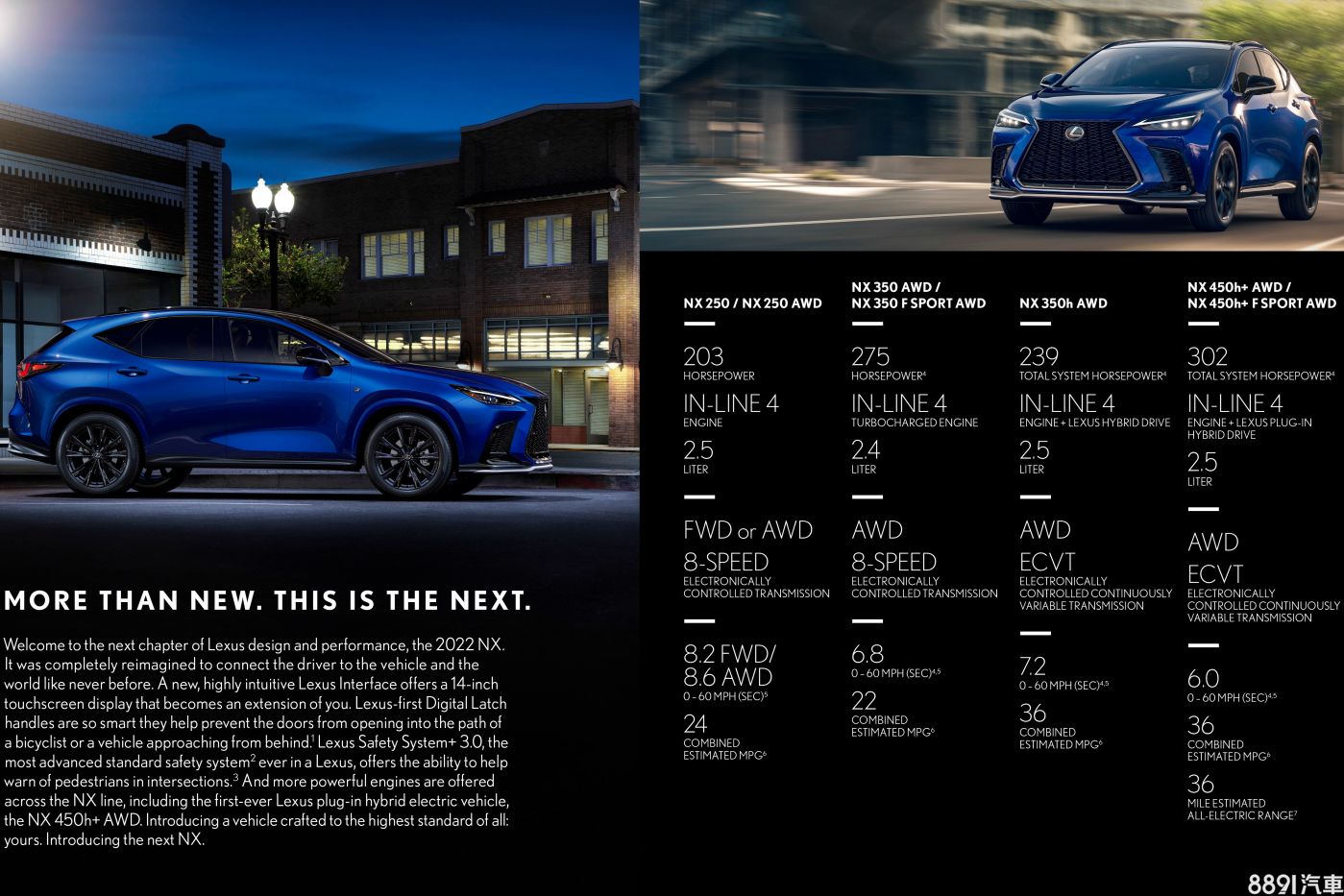 自美國先行網站上的簡式型錄可知,美規NX將提供NX 250、NX 350、NX 350h、NX 450h四種動力,其中僅NX 250有前驅和四驅版本可選,其餘均採四驅設定,另NX 350、NX 450h會推出F Sport車型。
