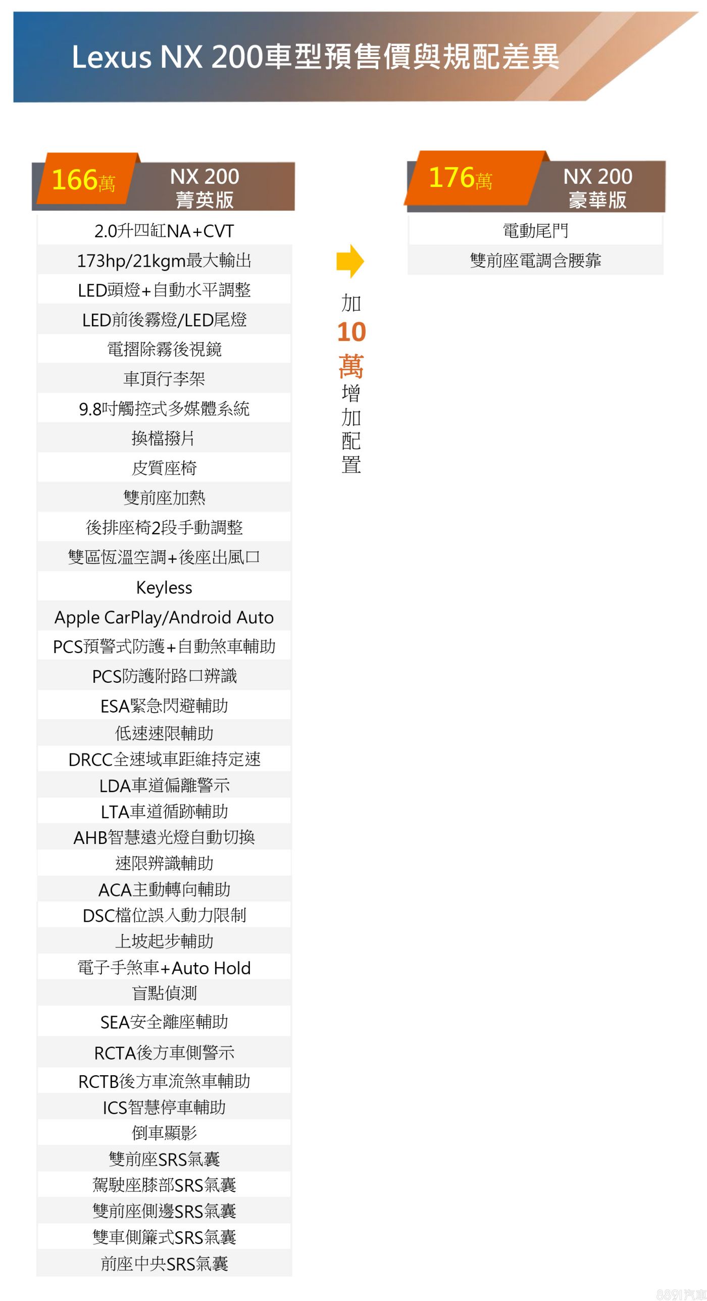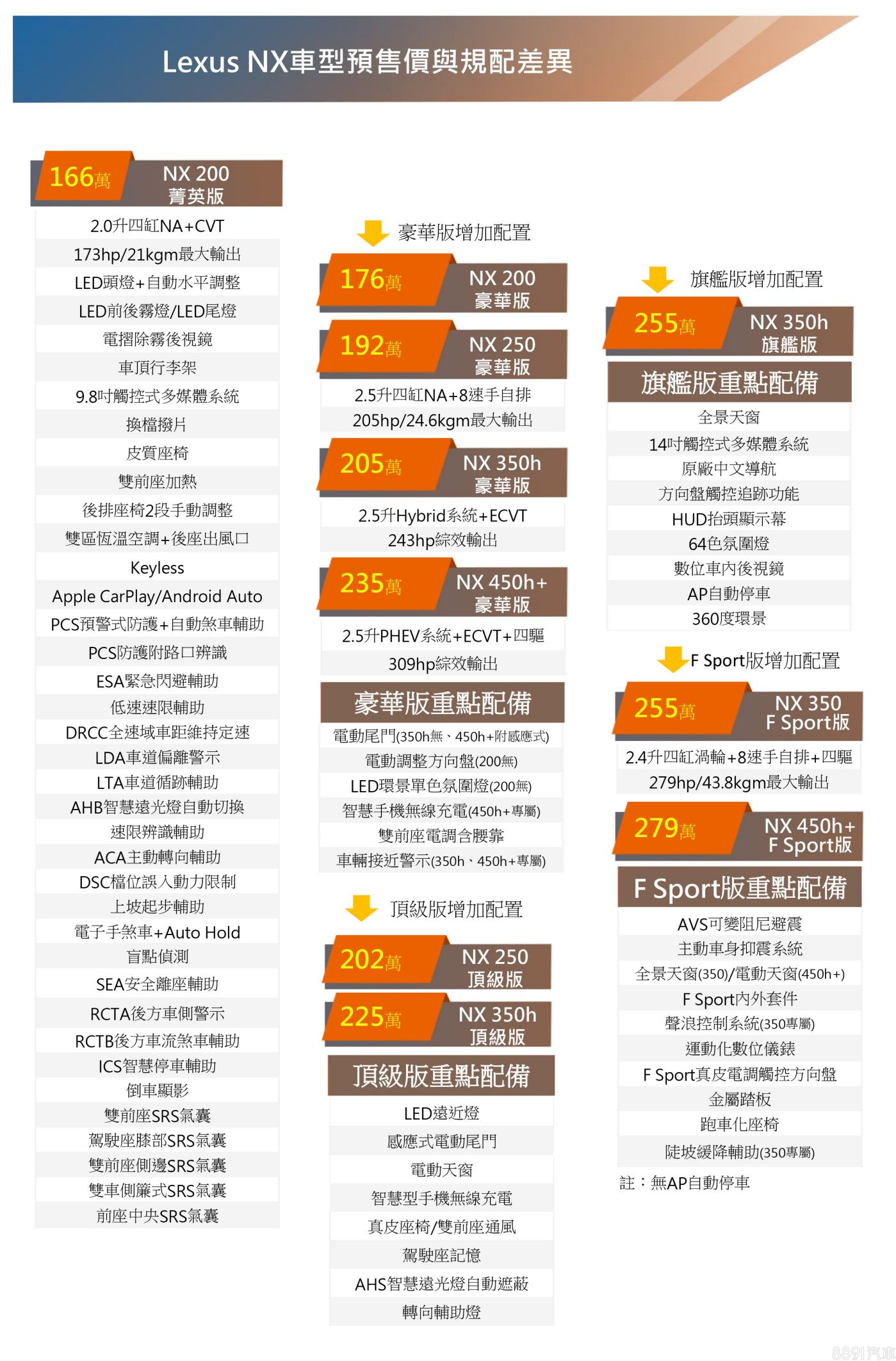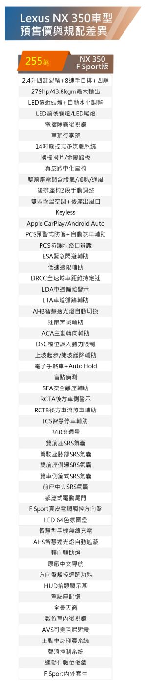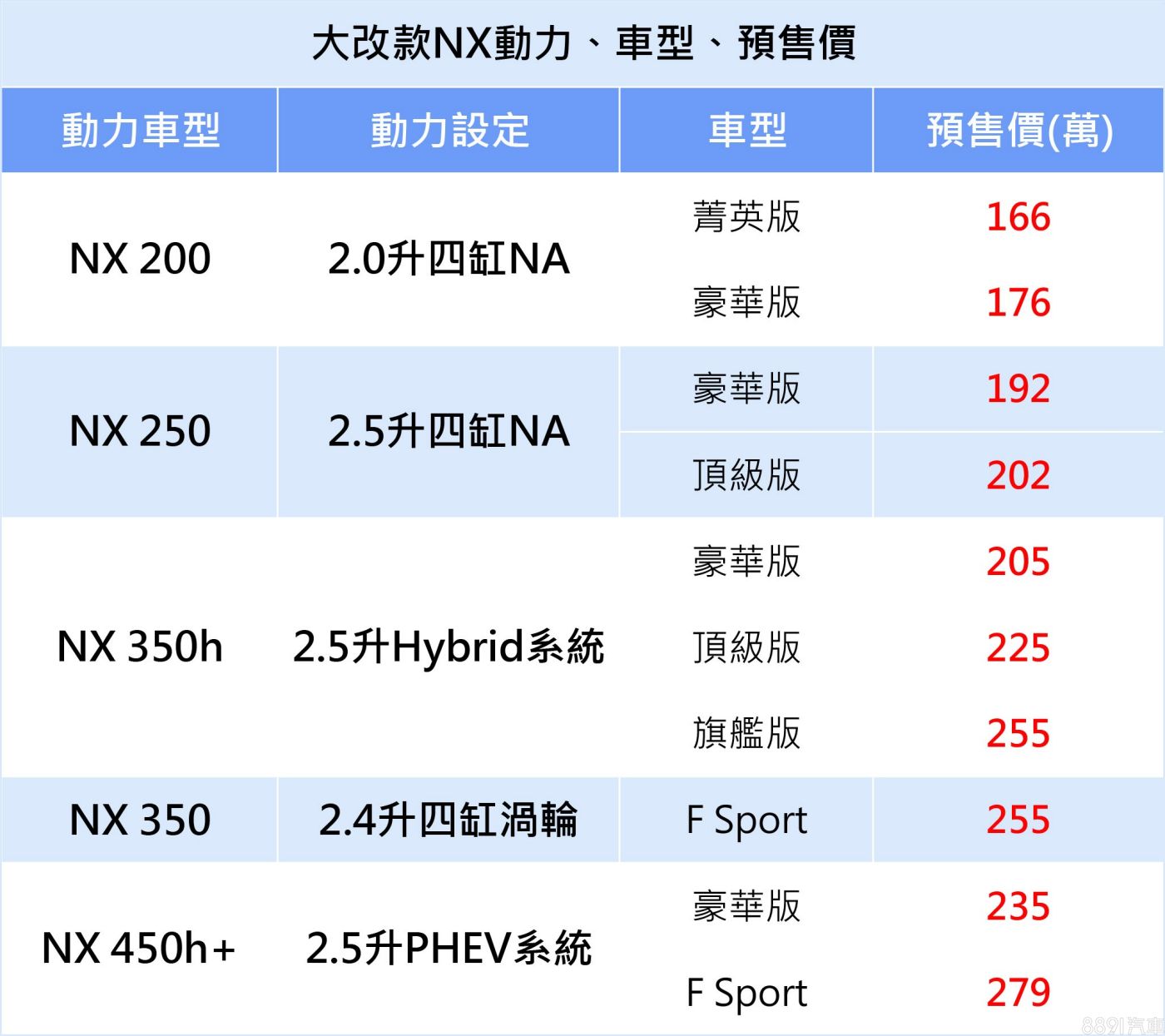 大改款NX車系共提供NX 200、NX 250、NX 350h、NX 350與NX 450h+共五種動力10車型,預售價格區間為166~279萬元,詳細編成與預售價格如附表。