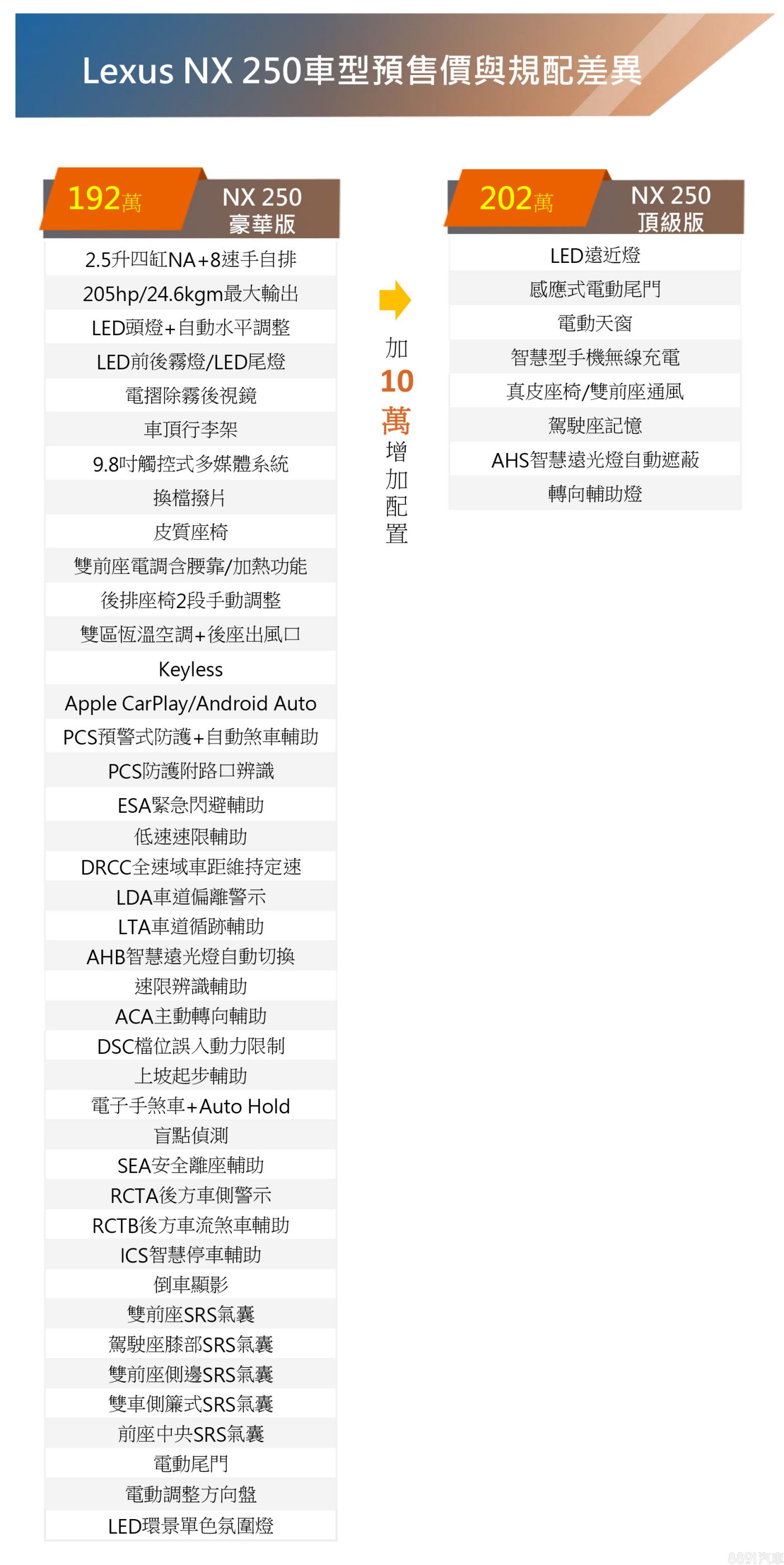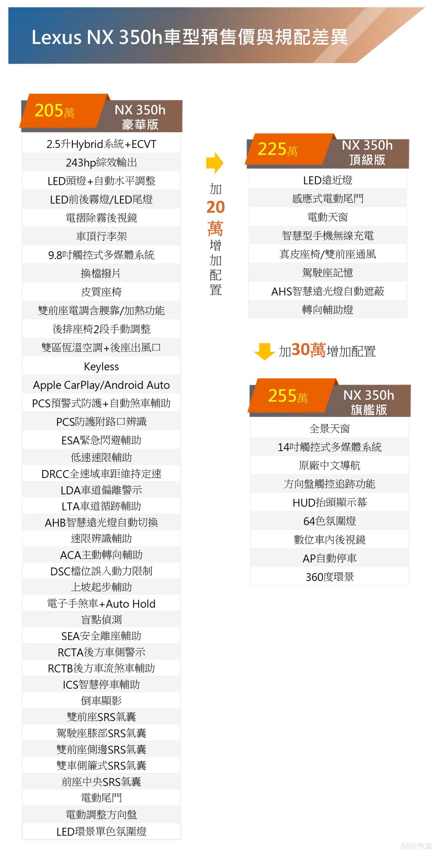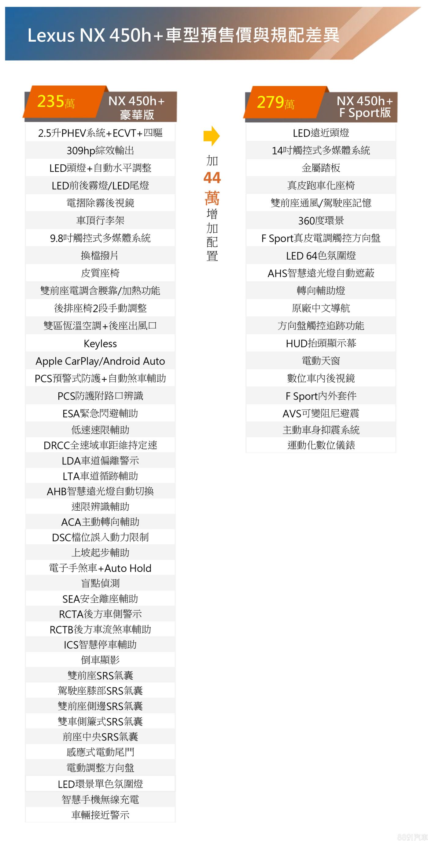 大改款NX車系共提供NX 200、NX 250、NX 350h、NX 350與NX 450h+共五種動力10車型,預售價格區間為166~279萬元,詳細編成與預售價格如附表。