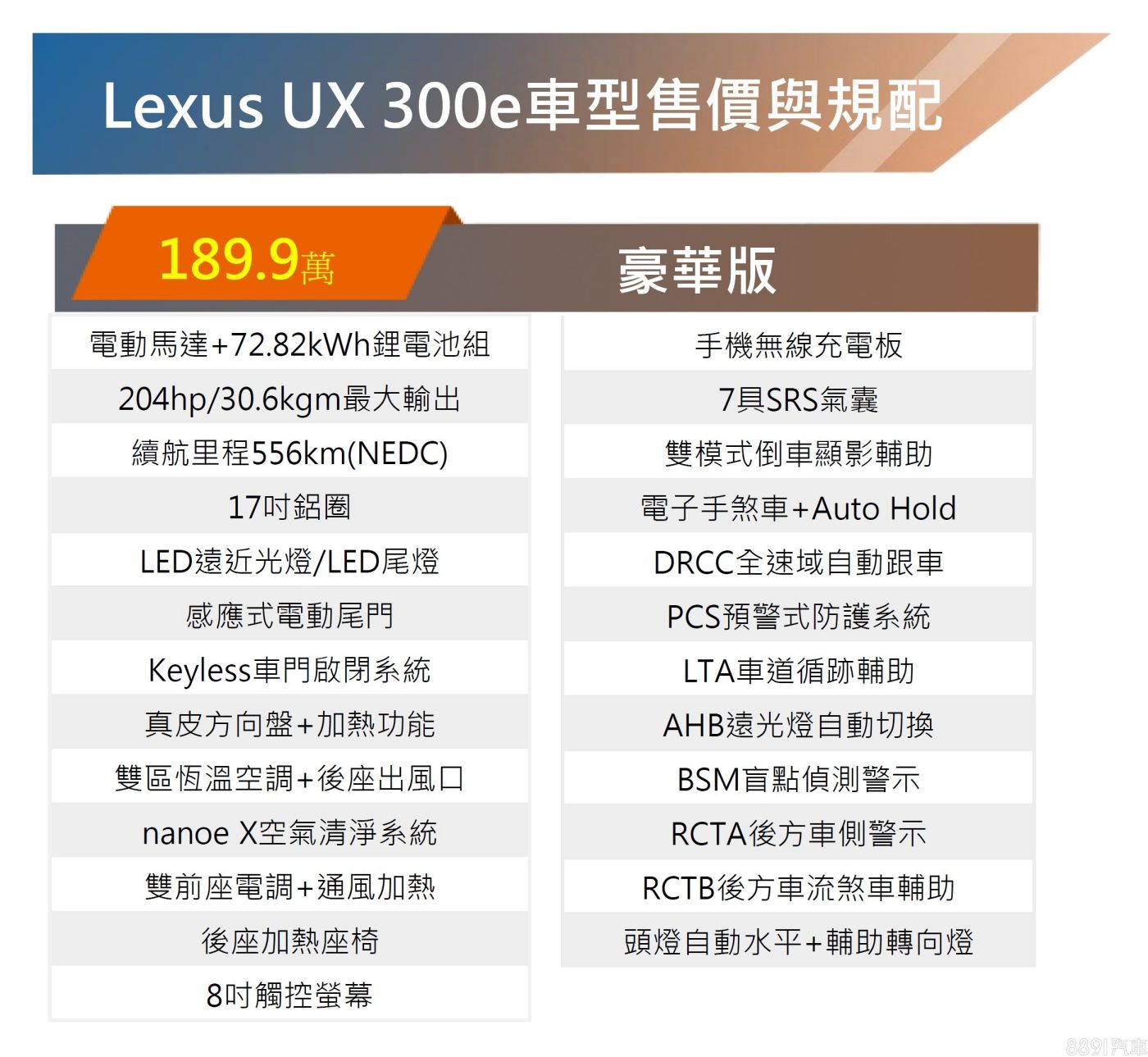 雖然和泰汽車尚未公布小改款Lexus UX 300e的上市消息,不過官網規配已更新為2023年式,販售車型維持「豪華版」單一規格,建議售價新台幣189.9萬,相比舊款漲了20萬,除了配備有所調整外,主要原因是換搭更大容量的電池組!