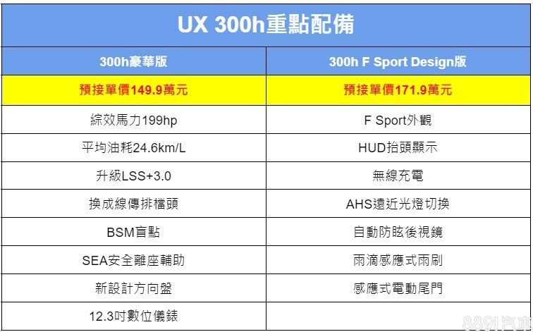 台灣部分,目前編輯部已接收到UX 300h接單消息,將推出300h豪華版、300h F Sport Design版兩款車型,接單價分別為149.9萬元、171.9萬元,未來正式配備編成也只有這兩款,200、250h將停止販售。