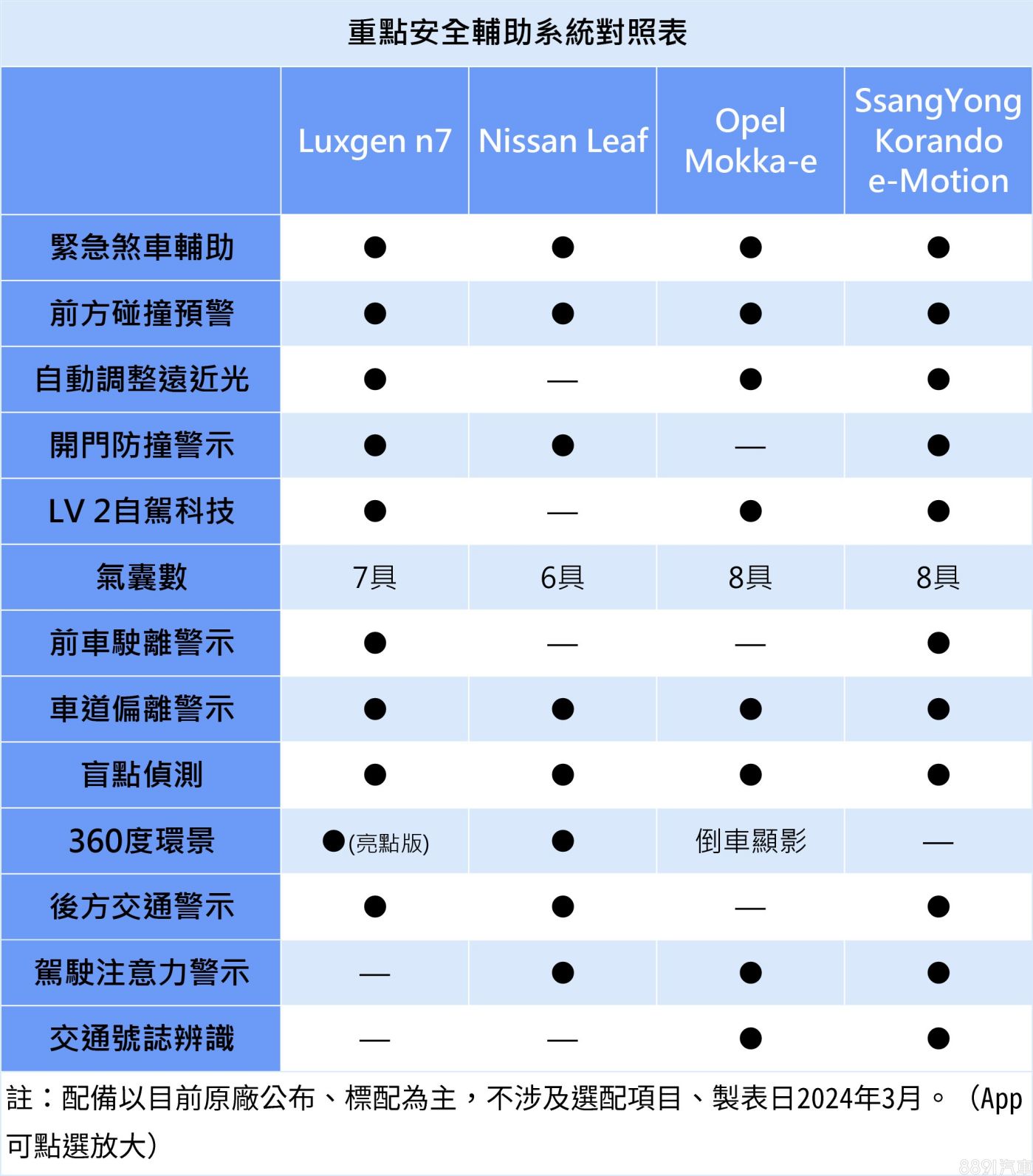 安全輔助項目部分,只有Nissan Leaf未標配符合Level 2自駕標準的科技,其餘三款車,雖不到「大滿配」的程度,但誠意也很夠了,瑕不掩瑜。