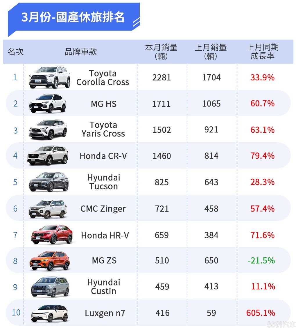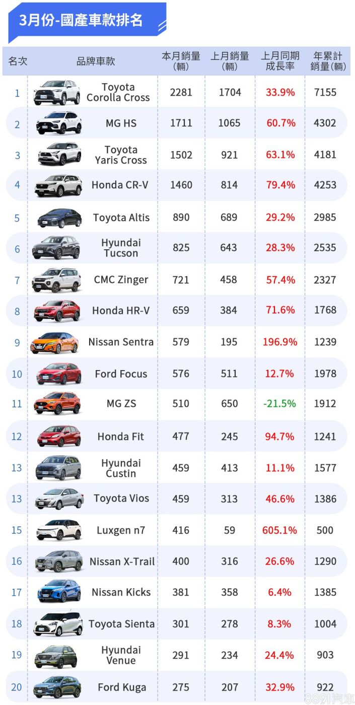 國產Top 20榜單,僅有MG ZS一款走下坡,其餘車款銷量一片「紅通通」!成長最多的莫過於3月開始大量交車的n7,帶領Luxgen品牌久違的又再進榜,若未來原廠交車穩定,相信會成為榜單常客。