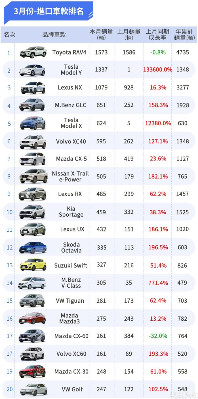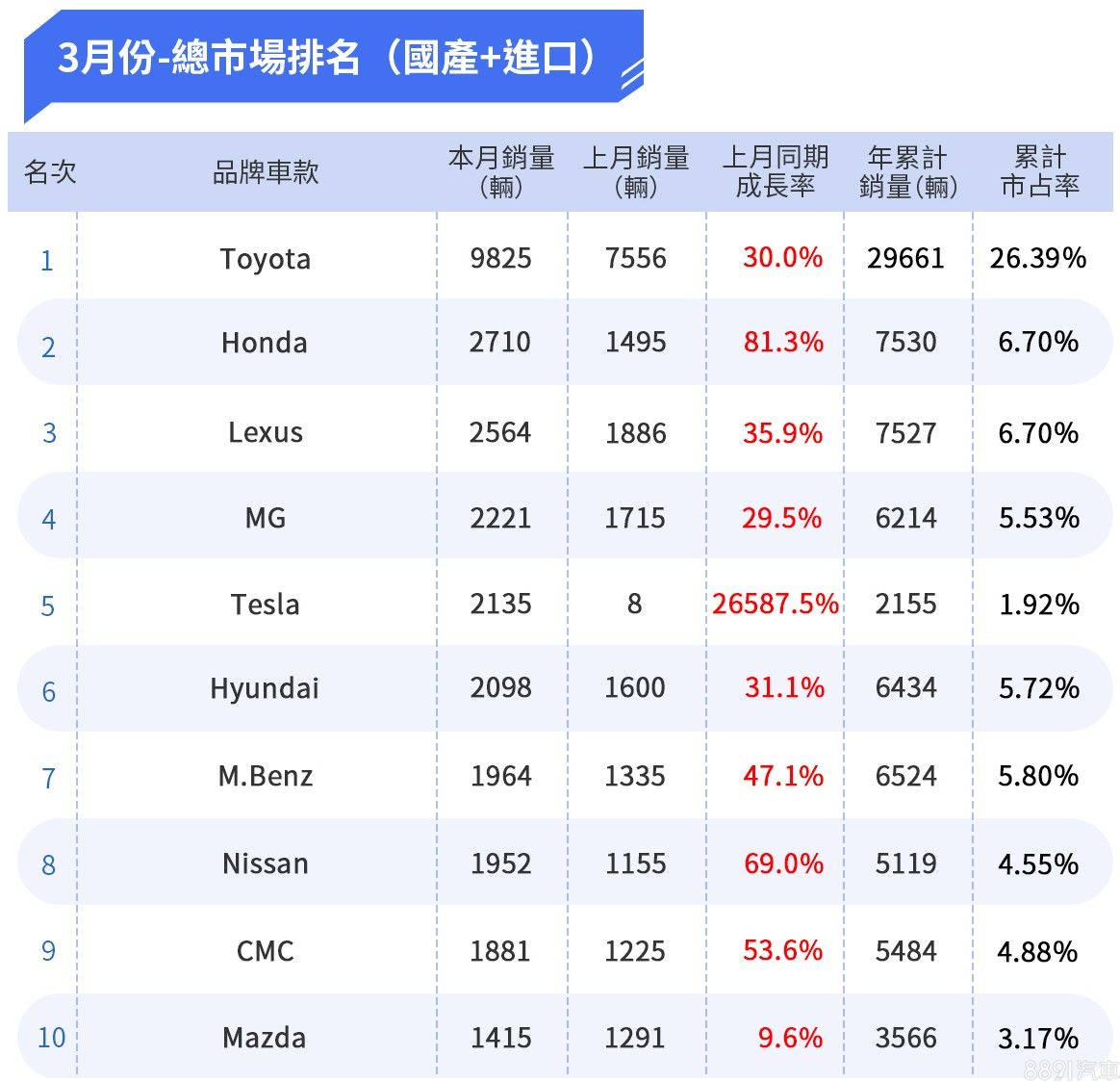 3月份總市場排名變動不小,Honda繳出2710輛、成長81.3%的成績單,直衝亞軍位置,而Tesla則是仗著Model Y破1300台的掛牌數,排名也從榜外空降第5名。