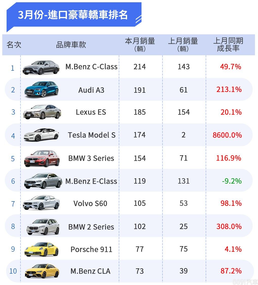 繼1月、2月連續兩個月的亞軍後,賓士C-Class靠著近5成的成長率,在3月終於攻上進口豪華轎車冠軍寶座,而前兩個月表現亮眼的E-Class,本月成績稍稍下滑,從第3名變到第6名。