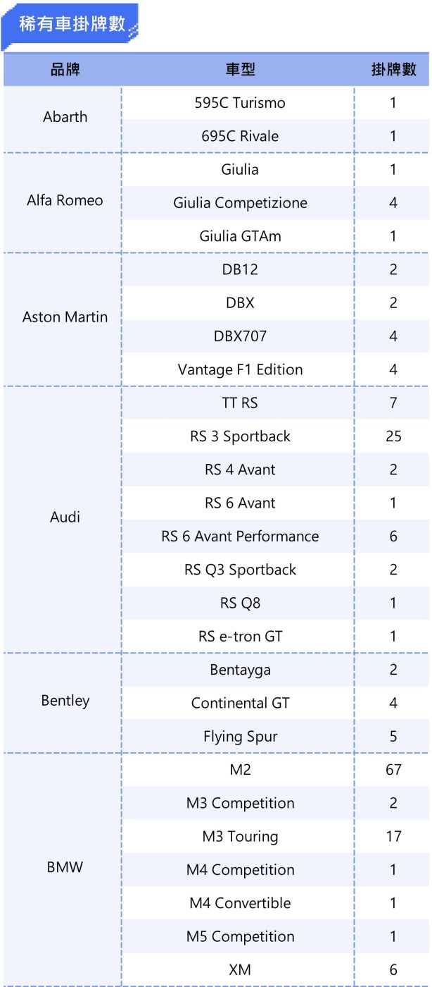 值得一提的是,保時捷911已連續兩個月上榜,今年累計掛牌282輛,對比去年同期有近一倍的成長,雖然對榜單中其他車款而言,這樣的掛牌數不算什麼,但以性能跑車為定位的911,除了受眾窄,最入門的911 Carrera也要686萬起,有這樣的成績確實不得不佩服台灣多金買家的能力。