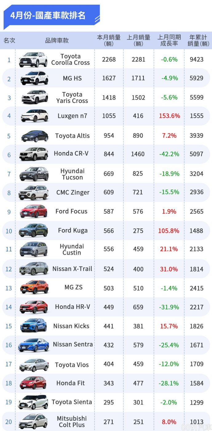 國產Top 20榜單前三名不變,依舊是Corolla Cross、HS、Yaris Cross獨霸一方,在總市場衰退的前提下,三車款銷量也都呈現下滑,其中以Yaris Cross衰退5.6%為最多。