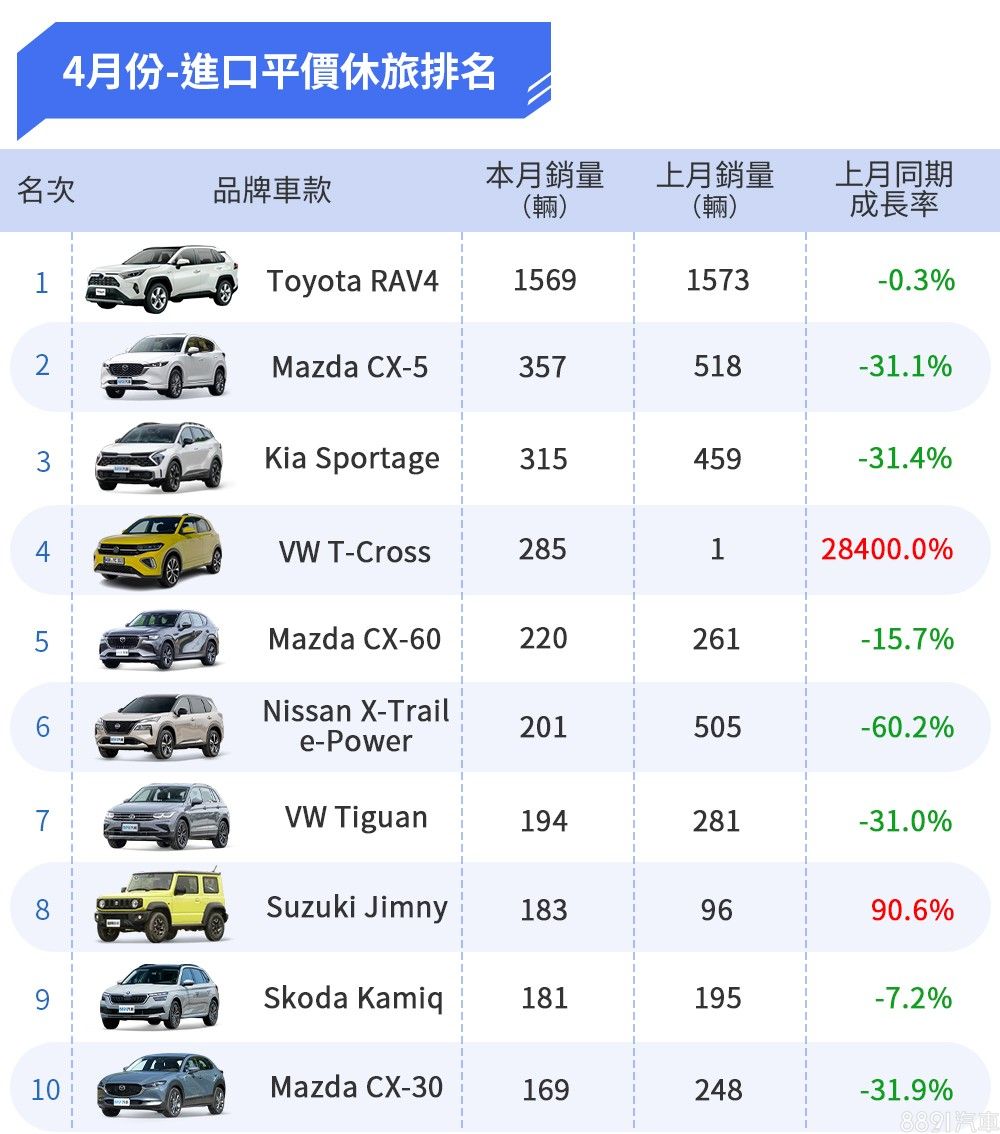 進口平價休旅前10名多數是常客,但還是有幾輛新進榜驚喜,除了福斯T-Cross小改款開始交付之外,Jimny在本月份也交出183輛,相比上月份成長90.6%,擠進第8名。