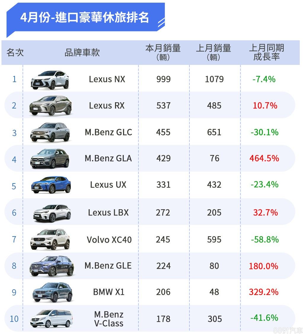本月特斯拉沒有新車到港,所以由「老面孔」Lexus NX重回進口豪華休旅的榜首,靠著每月穩定千輛左右的輸出,NX目前累計掛牌4276輛,穩居進口豪華休旅的銷售冠軍,此外,除了UX、RX,上個月沒擠進榜單的LBX本月也再度進榜,幫助Lexus全品牌在4月繳出2499輛的掛牌數,是進口車市場最大贏家。