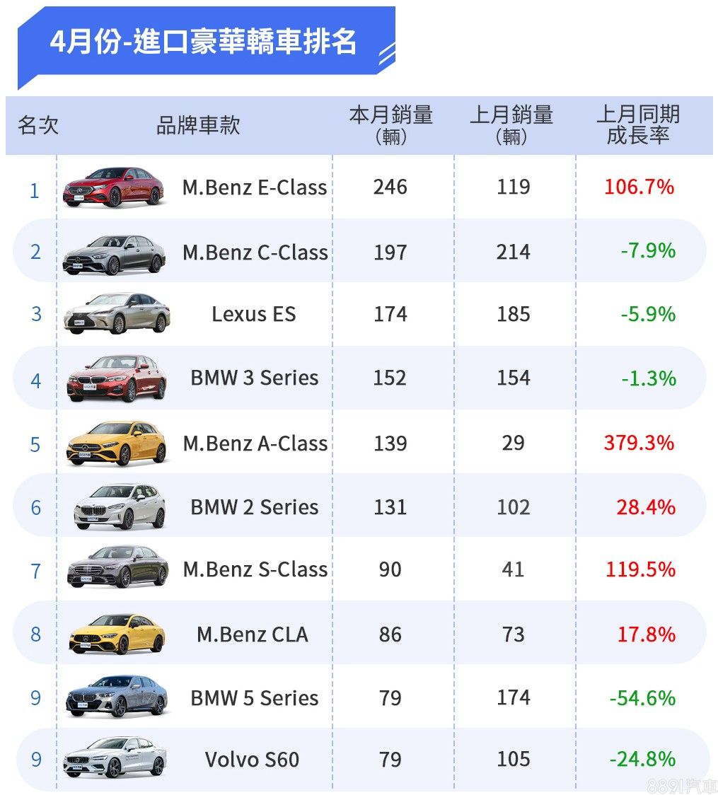 來到進口豪華轎車,本月是賓士的天下,共有五個車款進到前十榜單,直接至佔去一半,除了C-Class較上月下滑一些些,其他包含E-Class、A-Class、S-Class、CLA,掛牌數都呈正成長,表現相當亮眼。