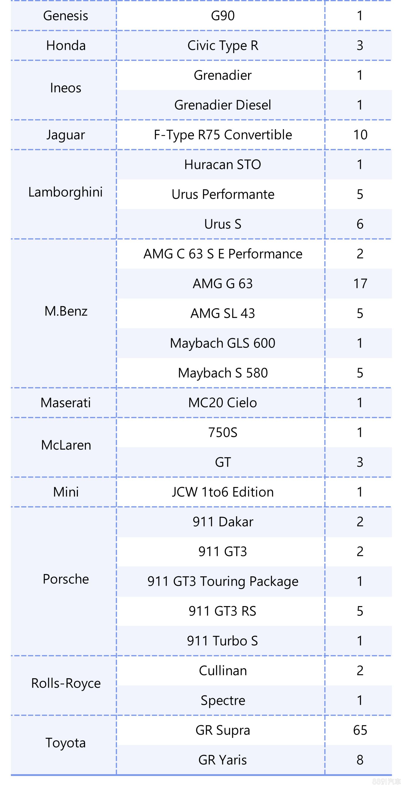 另外同樣表現亮眼的是賓士,本月與Lexus一樣都有四個車款上榜,GLC雖然較上月小幅下滑,但455輛的掛牌數依舊足以坐上季軍,而「三芒星」品牌中又以GLA的464.5%成長率最突出。