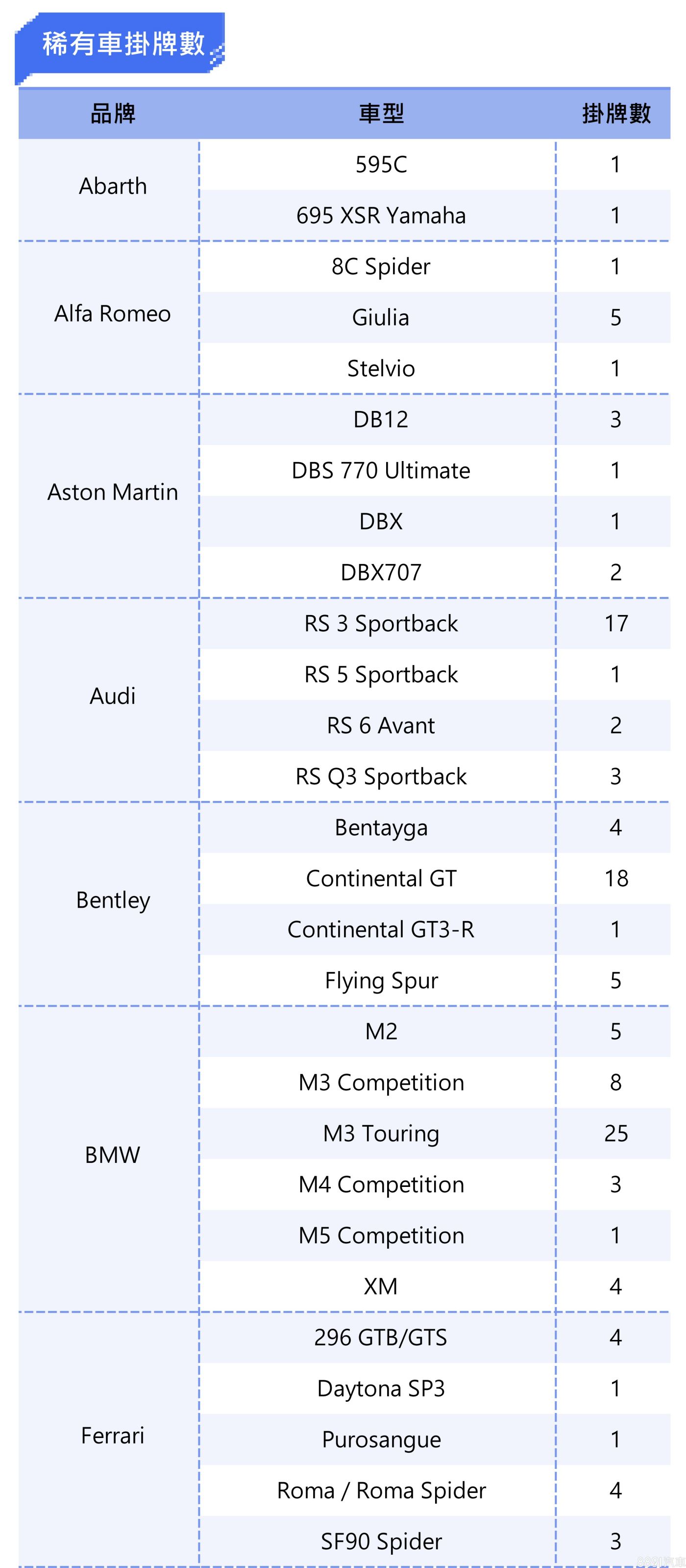 4月份的稀有車市場不算太熱鬧,層峰買家們到貨的玩具並不算多,比較值得一提的大概是Aston Martin DBS 770 Ultimate與Ferrari Daytona SP3,前者是全球限量300台、最大馬力770hp的DBS高性能車型,後者則是Ferrari Icona限量系列的第三款車型,搭載V12自然進氣引擎並具備經典賽車般的流暢線條,全球限量599輛。